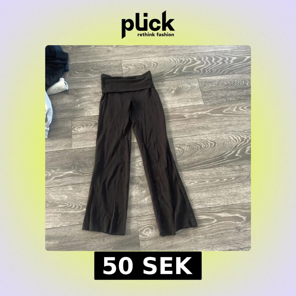 Svarta byxor från H&M med bootcut-ben och bred, mjuk midja. Tillverkade i stretchigt material som sitter skönt och följer kroppen. Perfekta för en chill och avslappnad look.