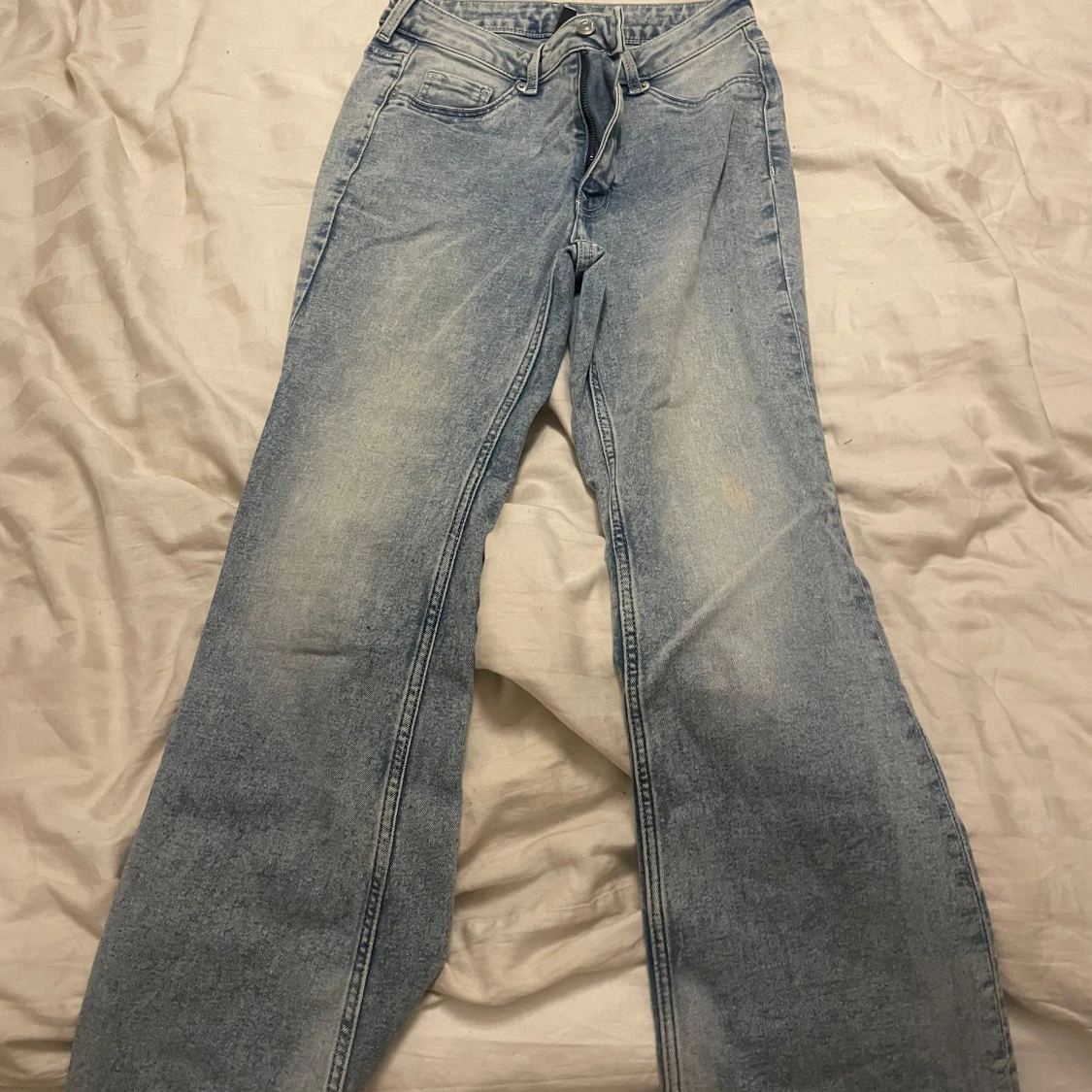 Säljer ett par ljusblå jeansbyxor med en avslappnad ljusblå färg. Använda 1 gång. Byxorna är lågmidjade