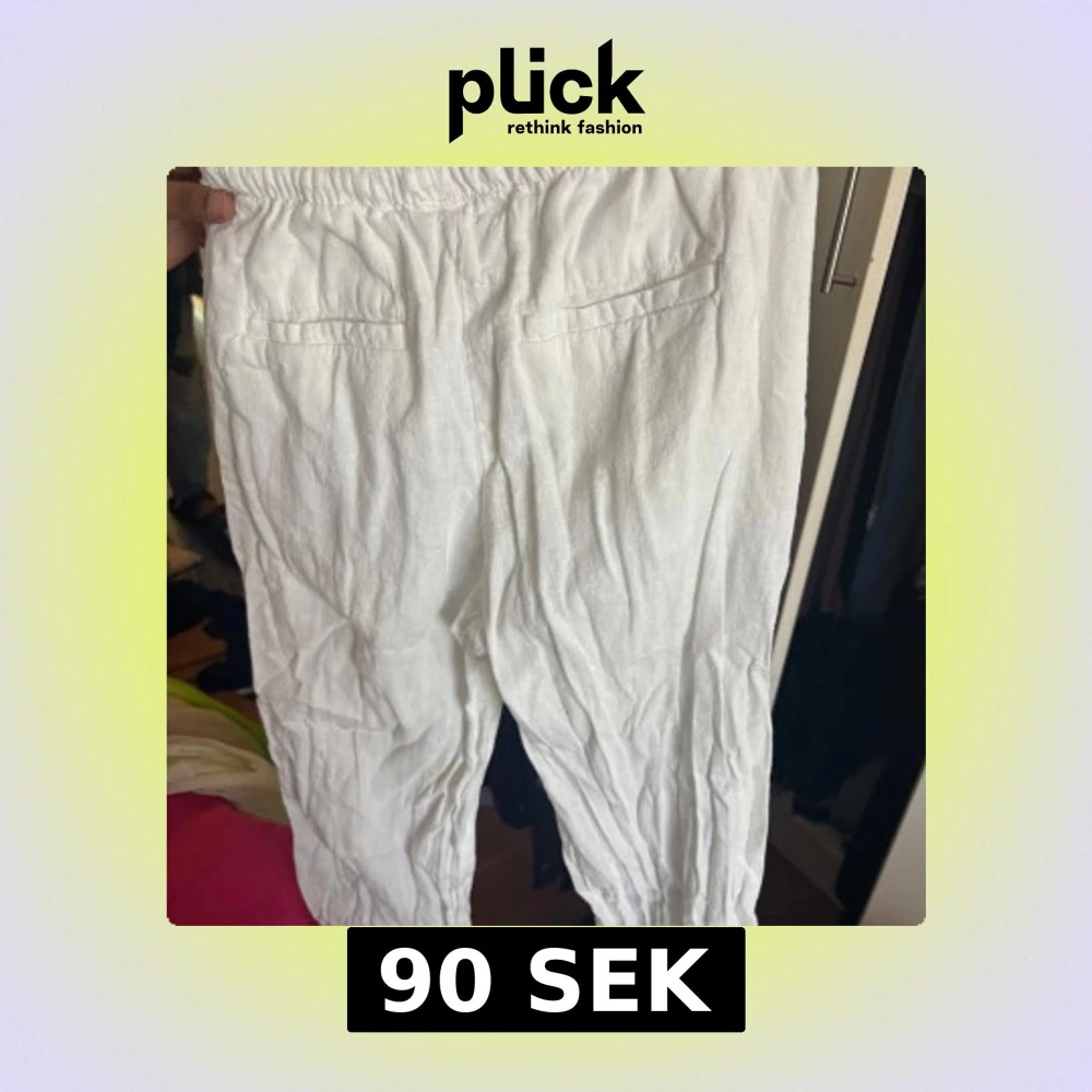 Säljer ett par vita linnebyxor med elastisk midja. Byxorna har en avslappnad passform och är perfekta för varma dagar. De har fickor baktill och är tillverkade i ett lätt och luftigt material. Köpt från Hm och Använd några gånger