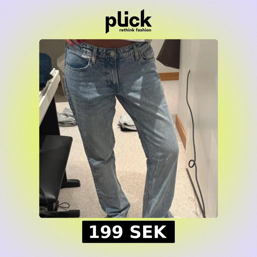 Säljer ett par klassiska h&m jeans i ljusblå tvätt med raka ben och fem fickor. Jeansen har hög midja och är tillverkade i slitstarkt bomullsjeans. Perfekt för dig som gillar en chill och tidlös look.