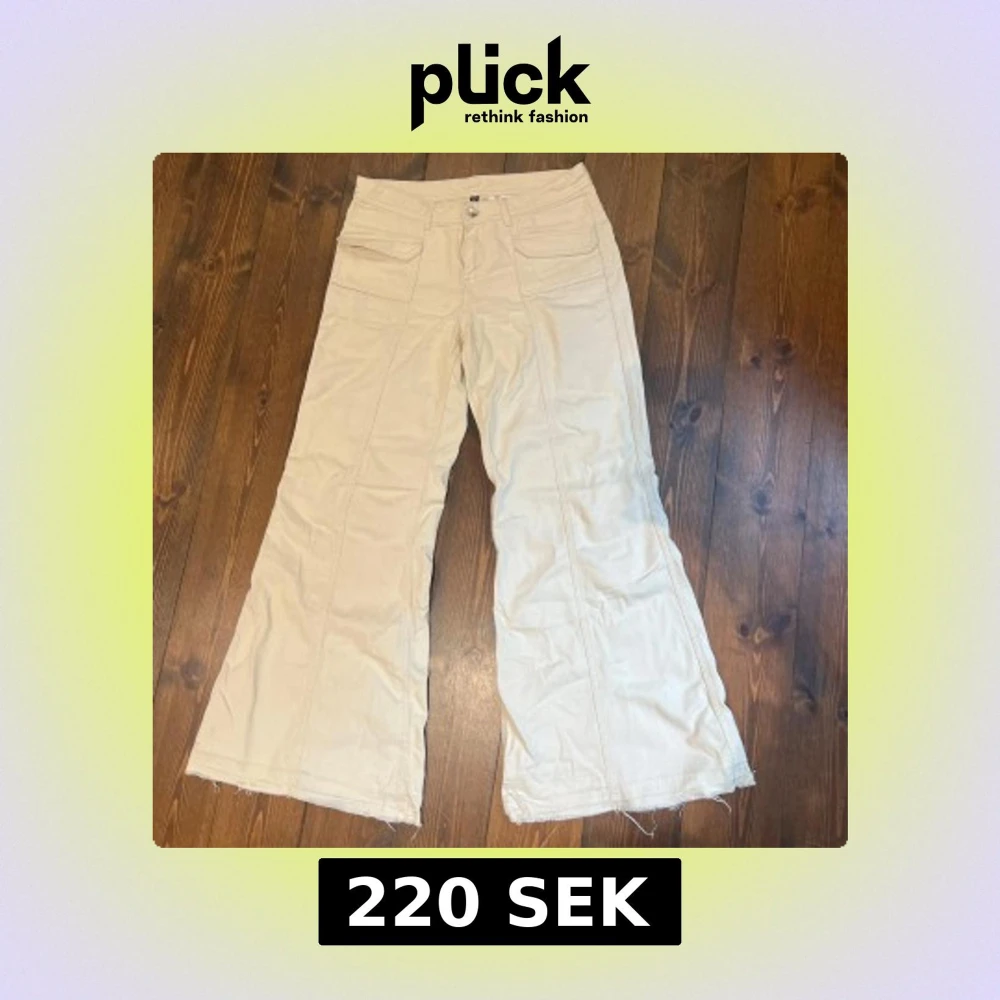 Säljer ett par beige cargopants med vida ben och råa, ofållade benslut. Byxorna har fickor framtill och stängs med dragkedja och knappar. Perfekta för en avslappnad och trendig stil.