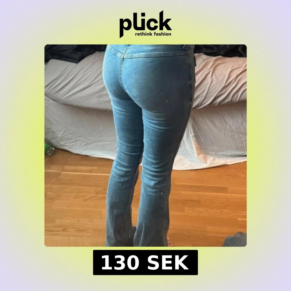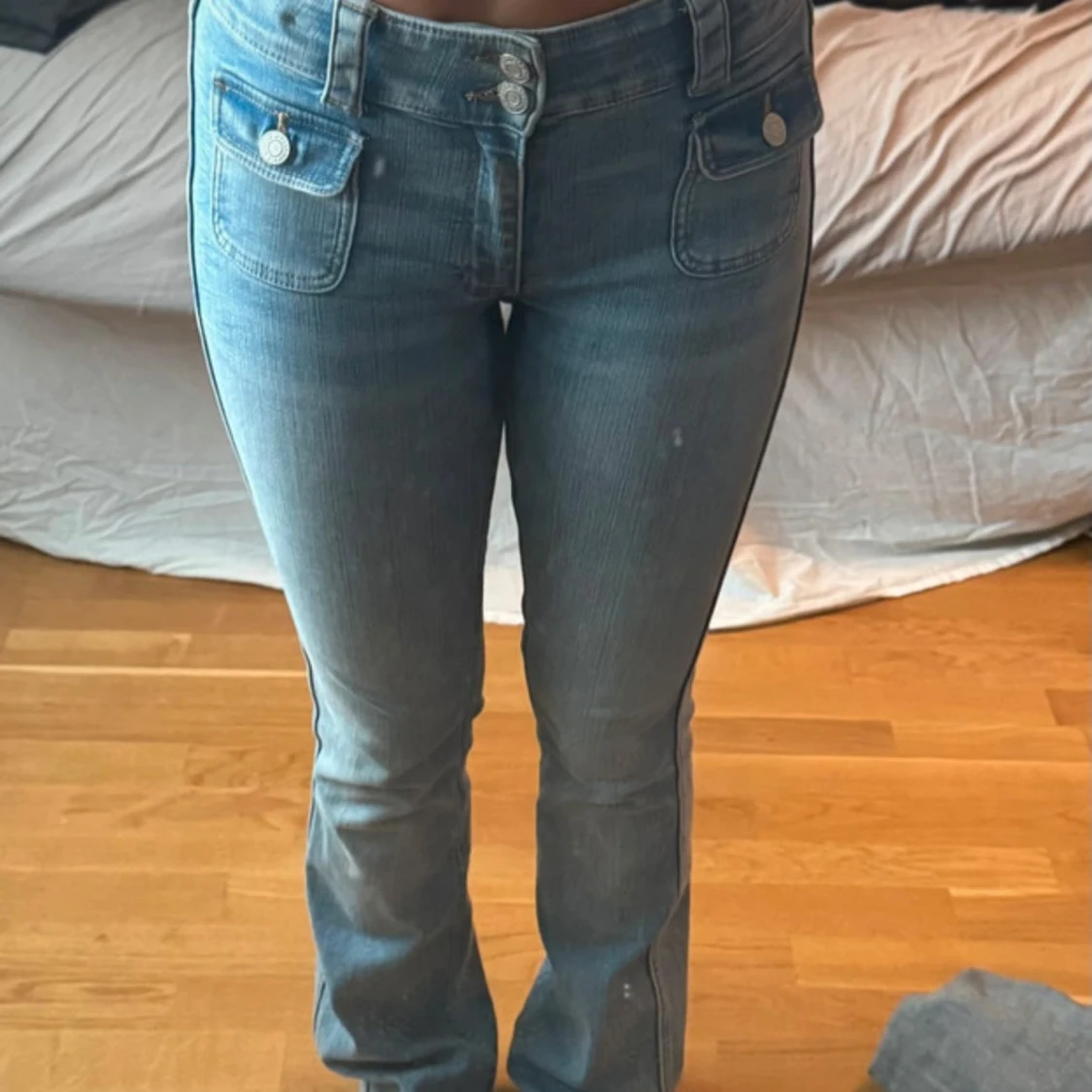 Säljer ett par snygga blå jeans med bootcut-modell och coola fickor framtill med lock och knappar. Jeansen har låg midja och klassisk denimlook, perfekta för dig som gillar en retrovibe. Stängs med dubbla knappar och dragkedja.