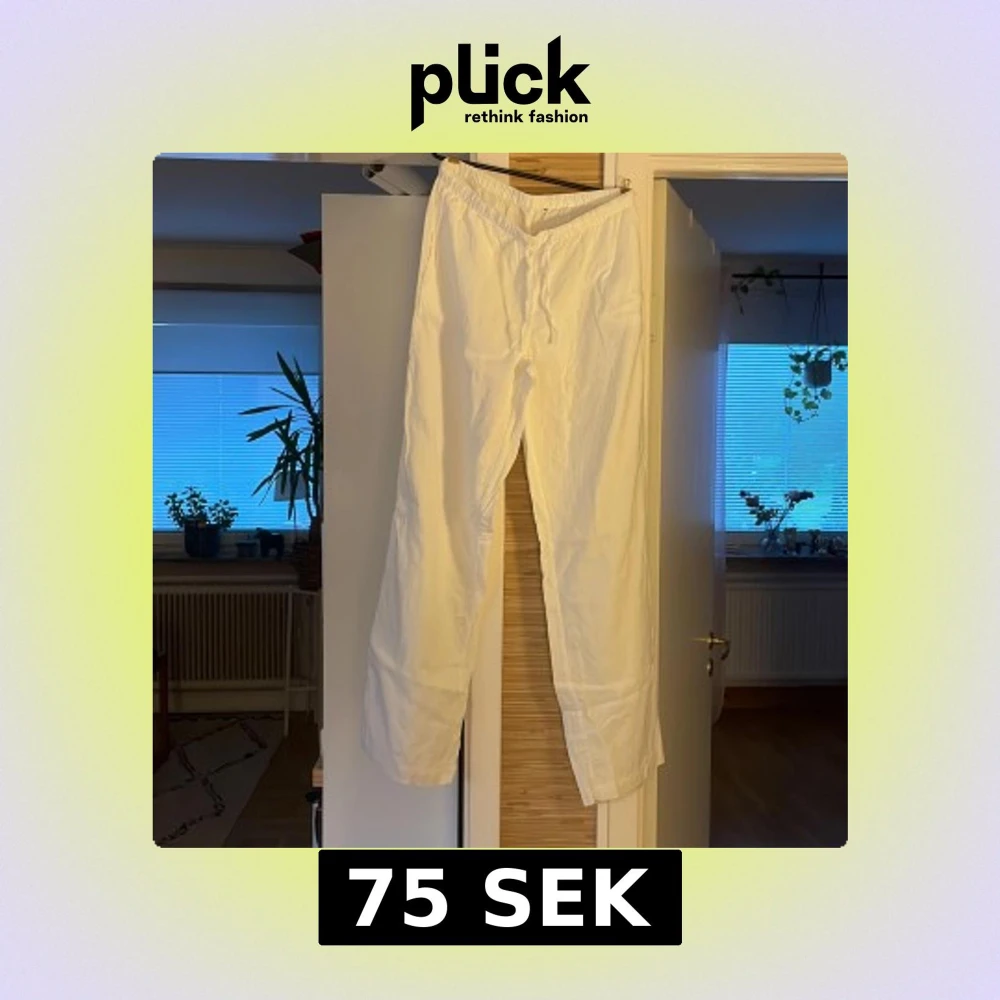 Säljer ett par vita linnebyxor med avslappnad passform och elastisk midja med snörning. Byxorna är raka i modellen och perfekta för en chill och stilren look. Lätta och luftiga, perfekta för varmare dagar.