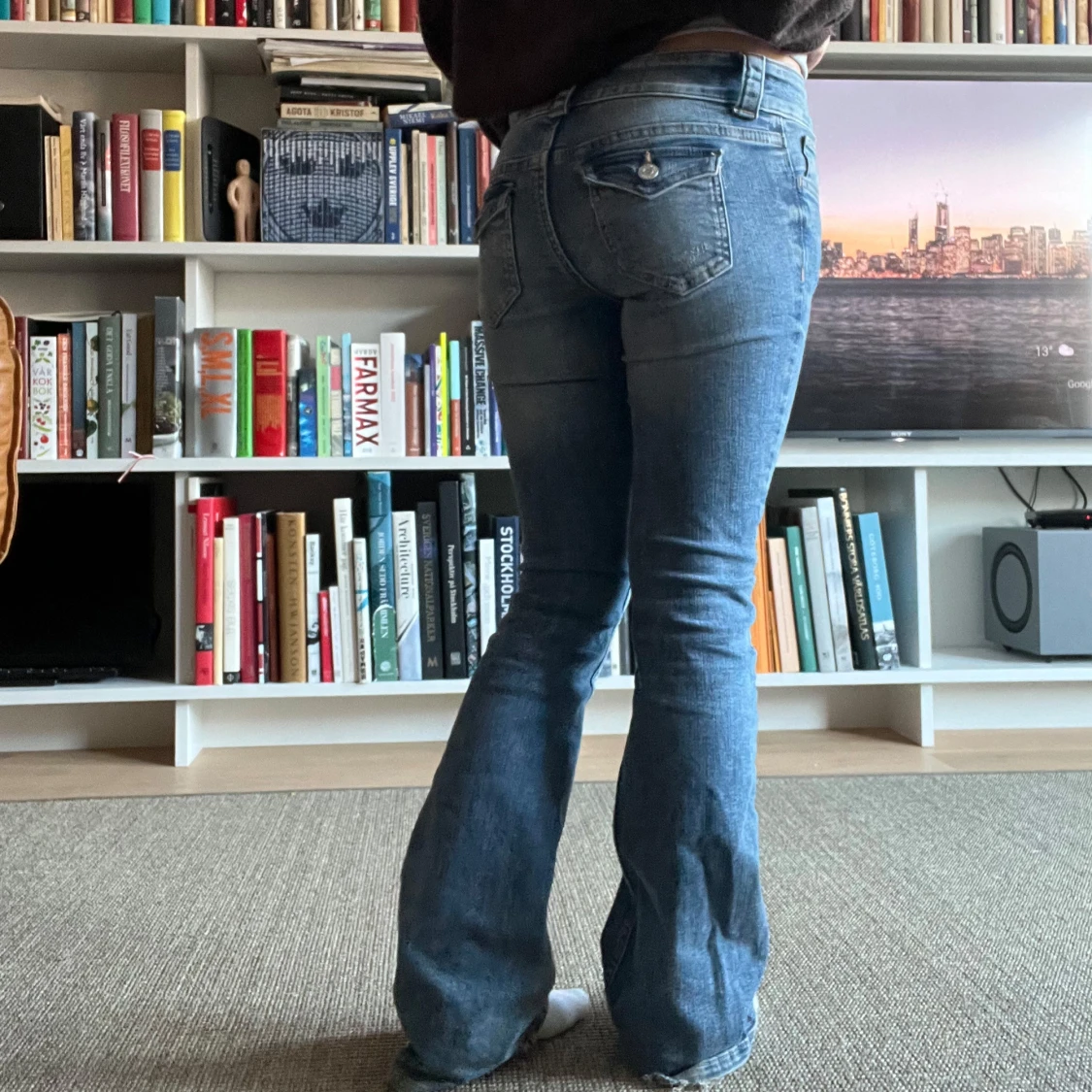 Säljer ett par blå bootcut jeans med snygg tvätt och dubbla knappar i midjan. Jeansen har klassiska fickor fram och bak, samt en liten ficka med lock och knapp bak. Perfekta för dig som gillar en retro vibe och vill ha ett par jeans med lite utsvängda ben.