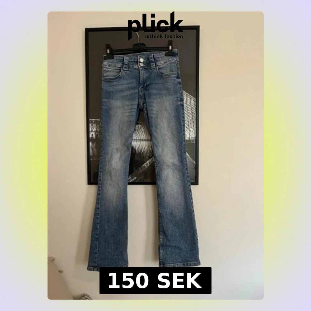 Snygga blå lågmidjade jeans med klassisk bootcut passform och ljus tvätt. Modellen har fem fickor, silverfärgade knappar och bälteshällor. Jeansen är tillverkade i jeansmaterial och har en cool, lite sliten look vid bensluten.