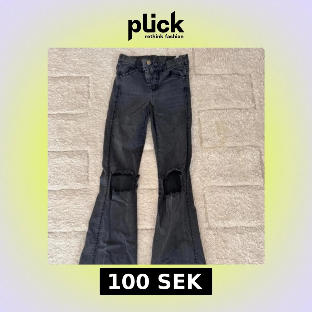 Säljer ett par svarta bootcut jeans med slitningar över båda knäna. Jeansen är midwaist och väldigt snygga på.