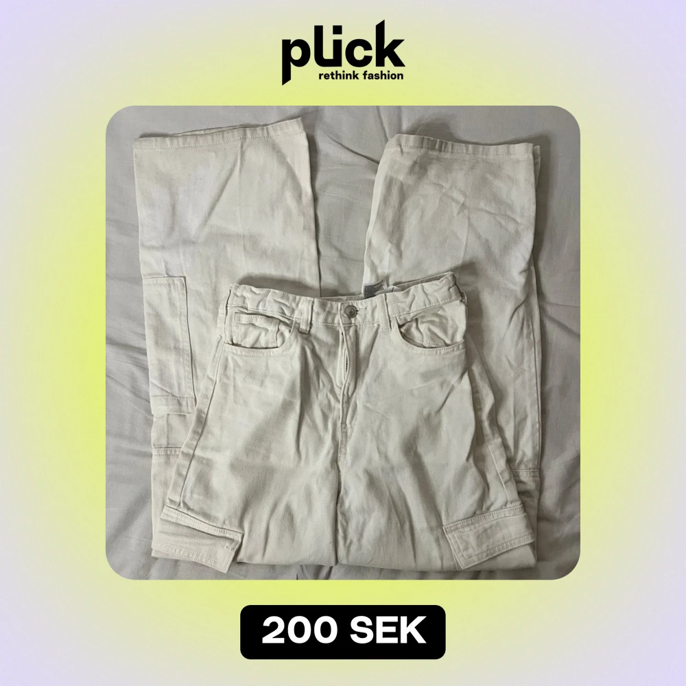Säljer ett par snygga vita cargopants i mycket bra skick. De har en dragkedja och knappar framtill samt praktiska fickor på sidorna. Perfekta för en avslappnad stil och passar till de flesta tillfällen. Storleken är inte angiven, men de ser ut att vara i en normal passform. Dock lite smutsigt där nere men de går bort vid tvätt.