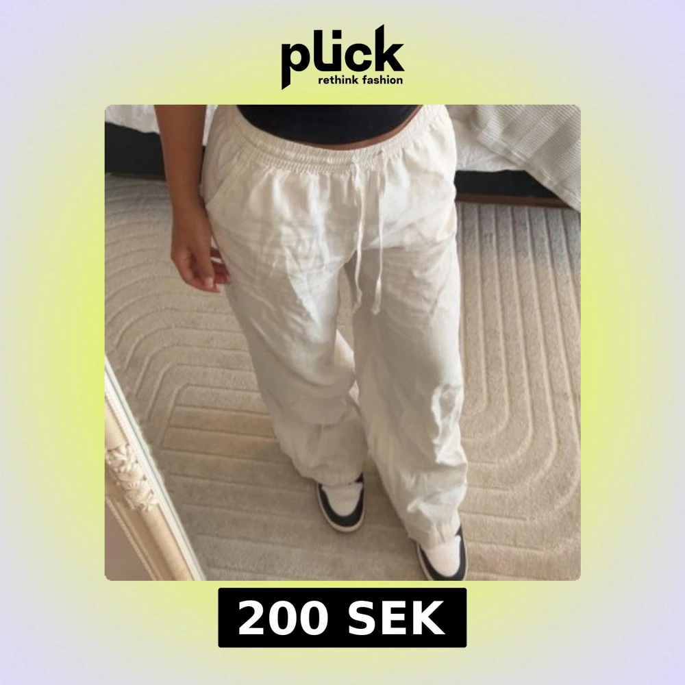 Säljer ett par vita linnebyxor med avslappnad passform och resår i midjan. Byxorna har snörning framtill och raka, vida ben. Perfekta för en chill och stilren look.