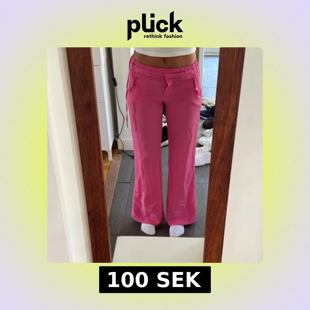 Säljer ett par snygga rosa byxor med breda ben och resår i midjan. Byxorna har snörning i midjan och fickor framtill.
