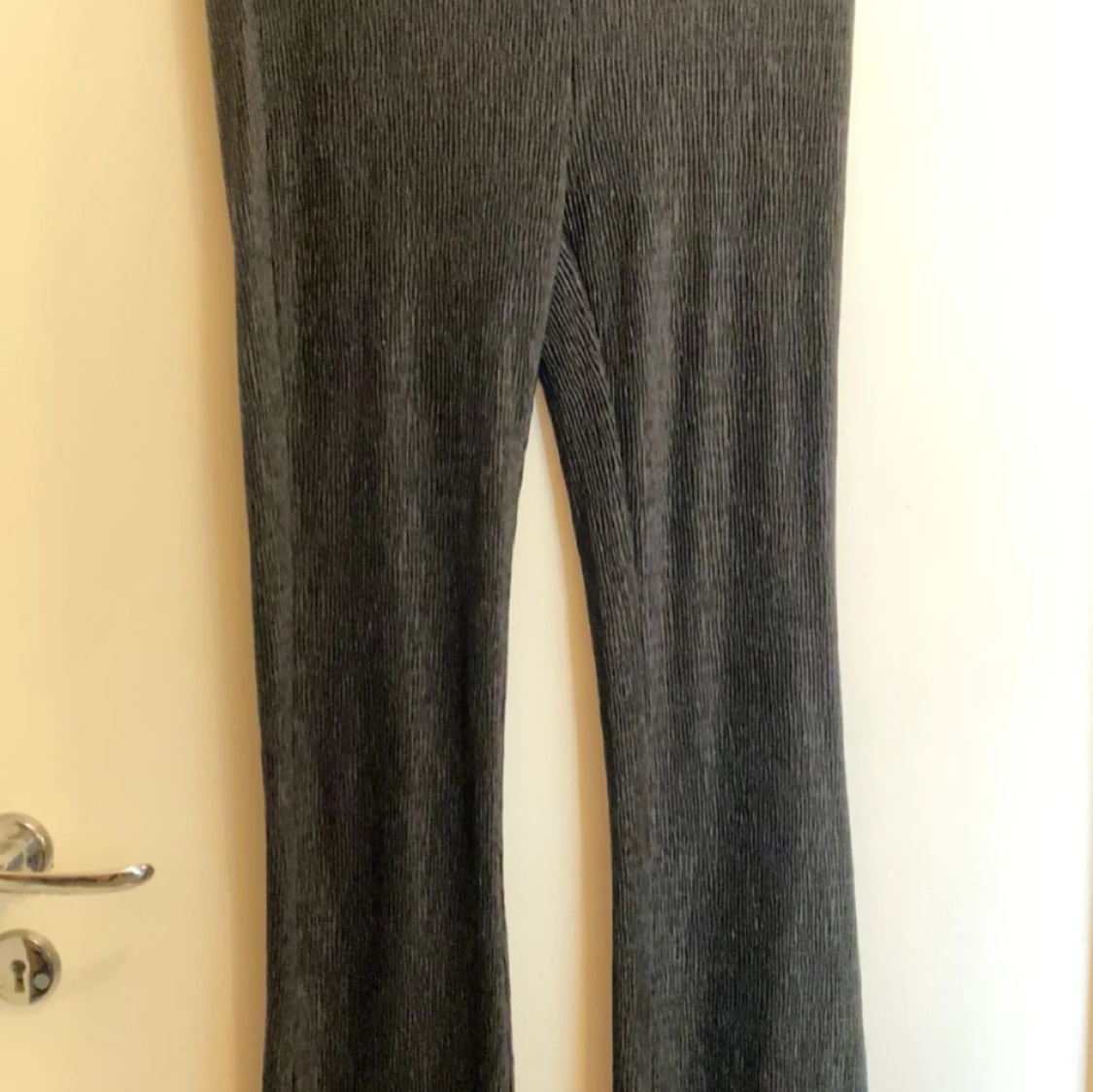 Snygga grå byxor med ribbad textur. De har en bekväm passform och är perfekta för en avslappnad stil. Byxorna är i en neutral grå färg som är lätt att matcha med olika toppar. De är i nyskick från Hm i storlek XS