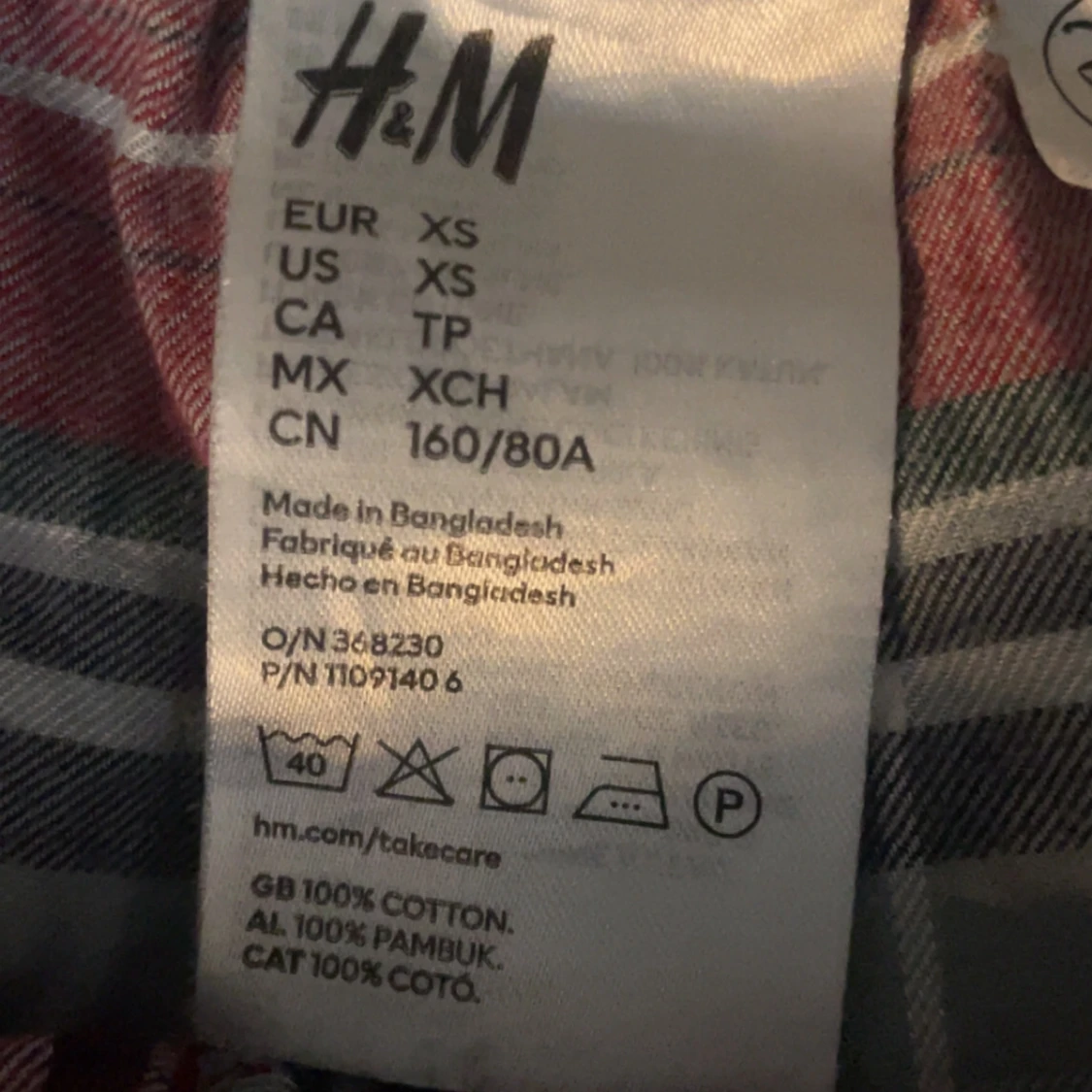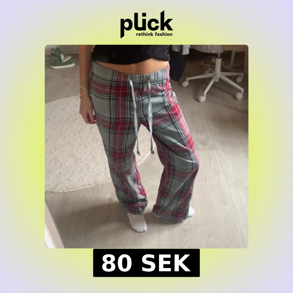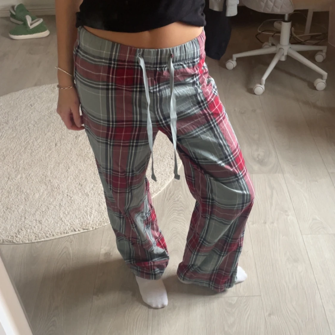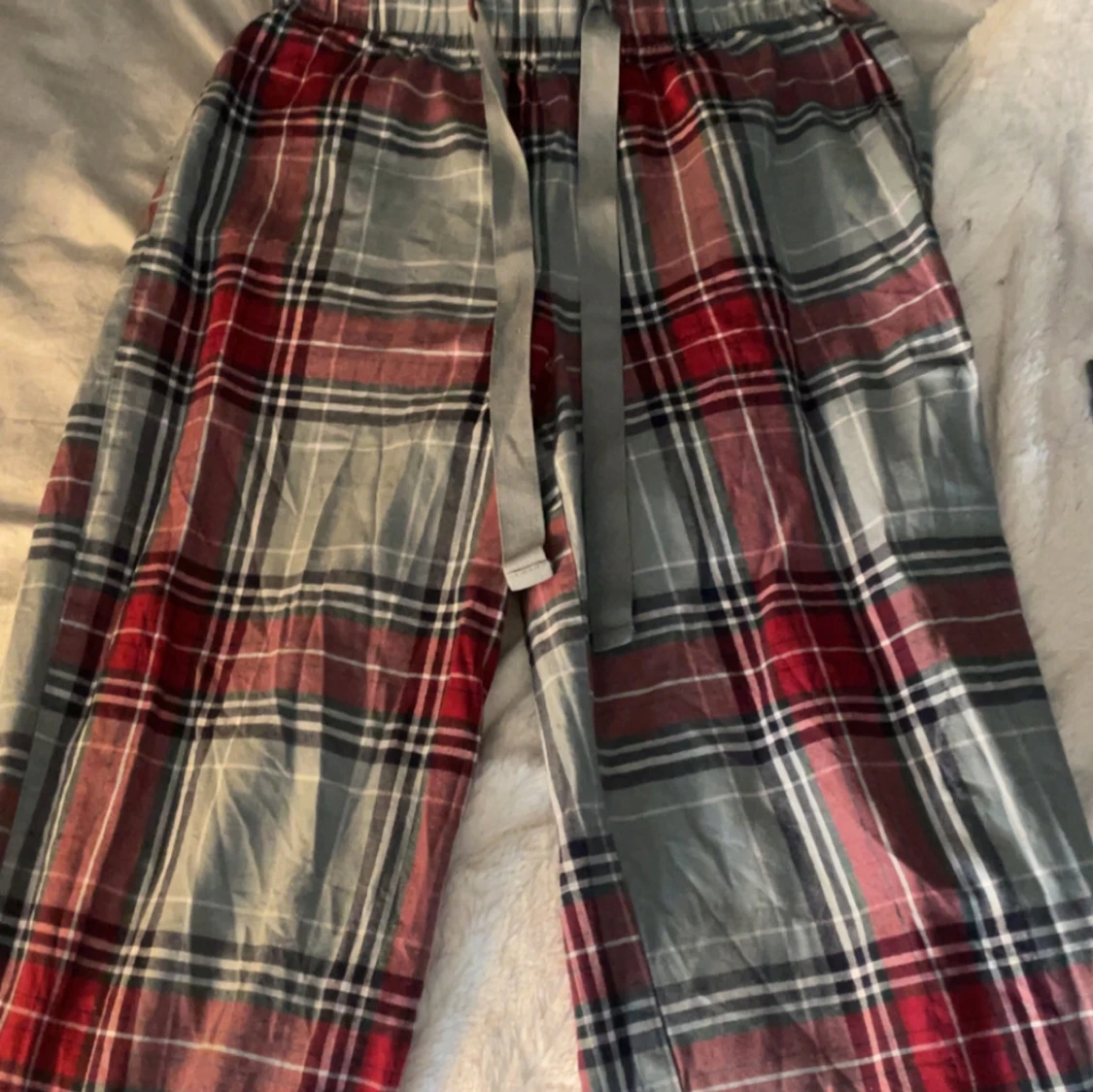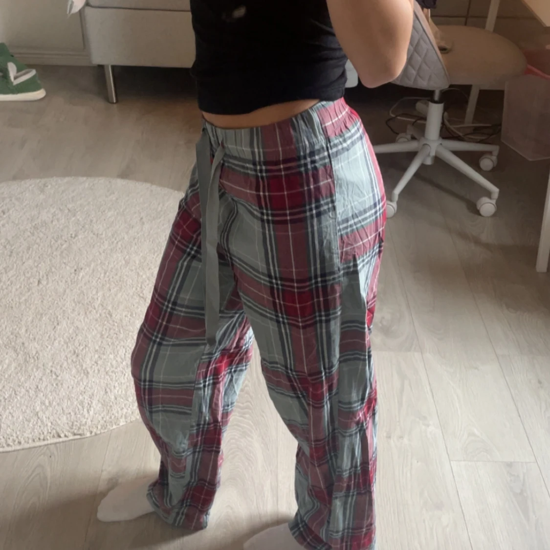 Säljer ett par rutiga byxor från H&M i storlek XS. De har en loose passform, snörning i midjan och är tillverkade i 100% bomull. Färgerna är röd och grå med ett klassiskt rutmönster. Perfekta för chill dagar hemma eller när du vill vara extra comfy.
