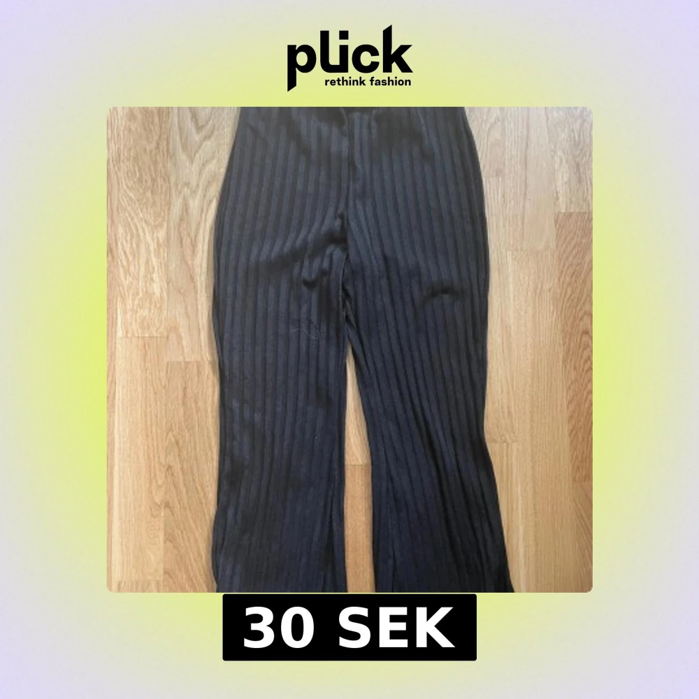 Säljer ett par svarta byxor med breda ribbade ränder och skön, lite lös passform. Byxorna har vida ben och är perfekta för en chill och trendig look. Passar dig som gillar stilrena och bekväma plagg.