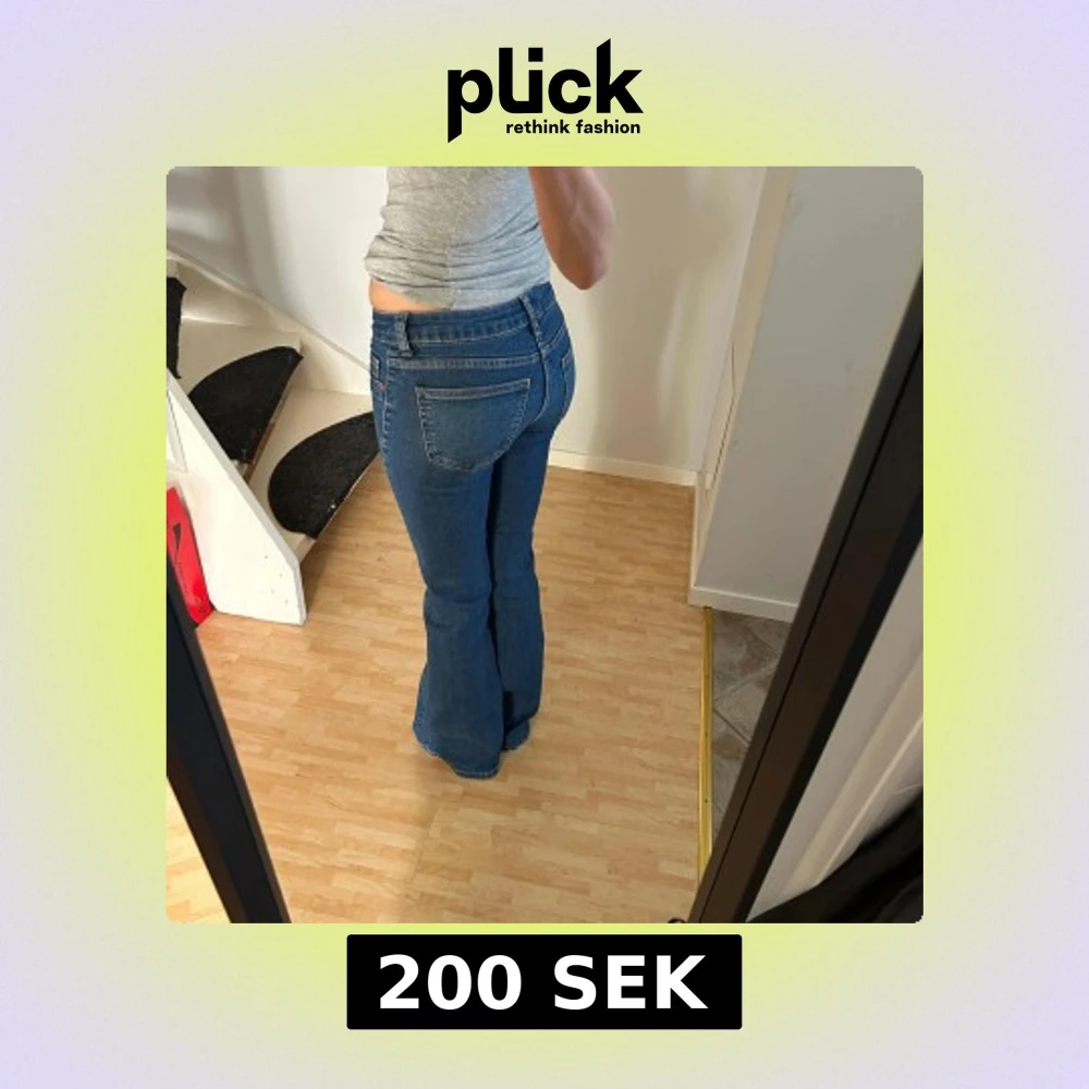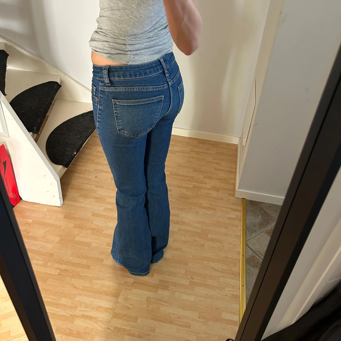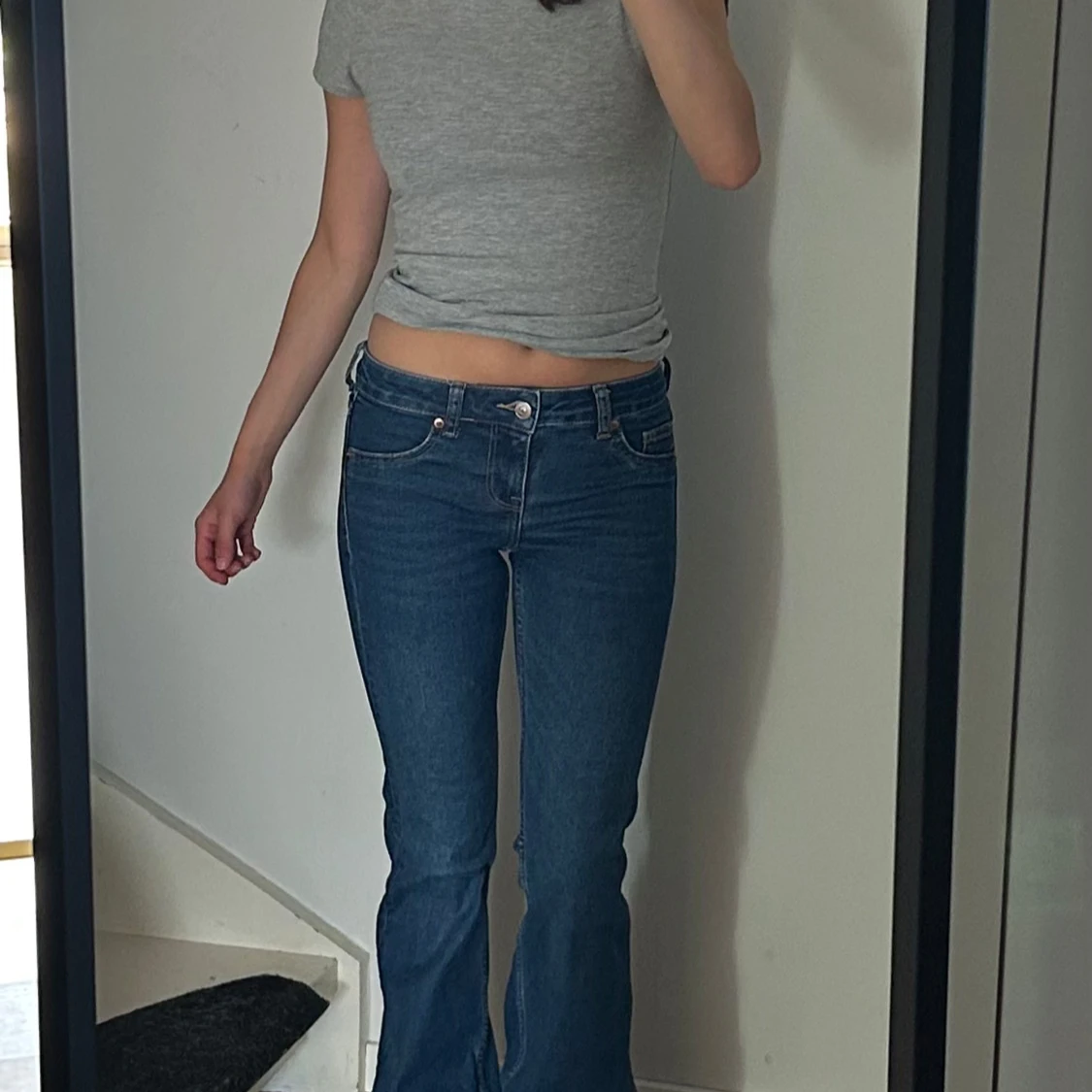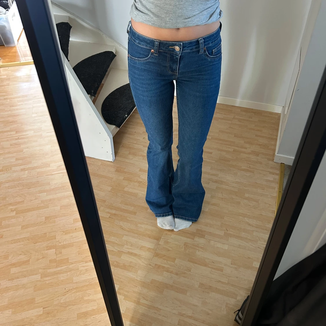Snygga blå jeans från med bootcut passform och låg midja. Från HM. Kommer ej till anvöndning. I storlek 32 men jag brukar normalt ha 34.