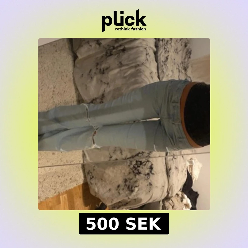 Säljer ett par ljusblå jeans med bootcut passform och snygga hål vid knäna. Jeansen har klassisk femficksdesign, normal midja och är tillverkade i jeansmaterial. De är stretchiga så de passar från xxs-s.