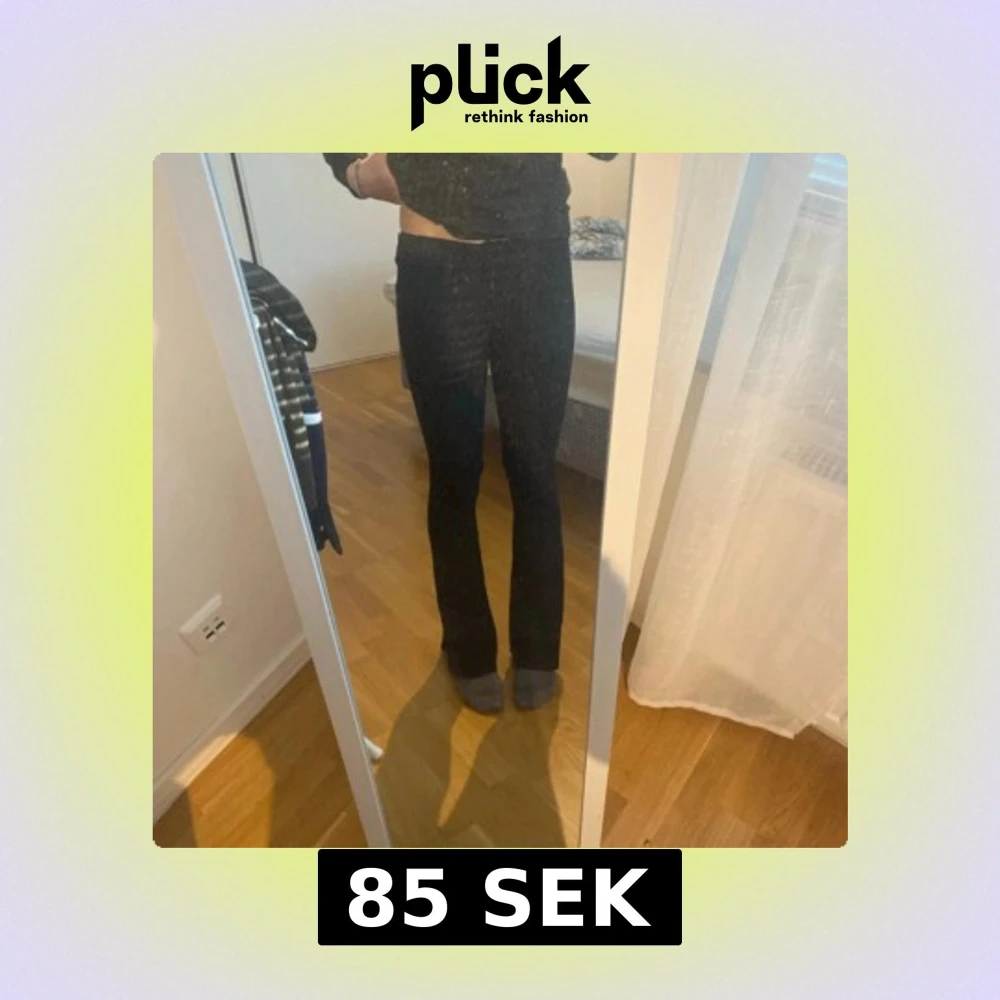 Säljer ett par svarta ribbade byxor med en tight passform. Byxorna är mid waist (man kan vika ner de så att det blir lågmidjade )och har en stilren design som passar perfekt för en trendig look.