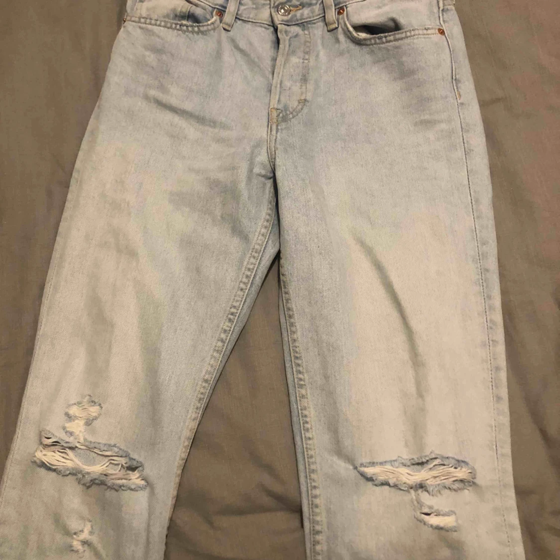 snygga ljusa jeans med två snygga hål på knäna. säljer pågrund av att jag köpte en storlek för stora. nästan aldrig använda