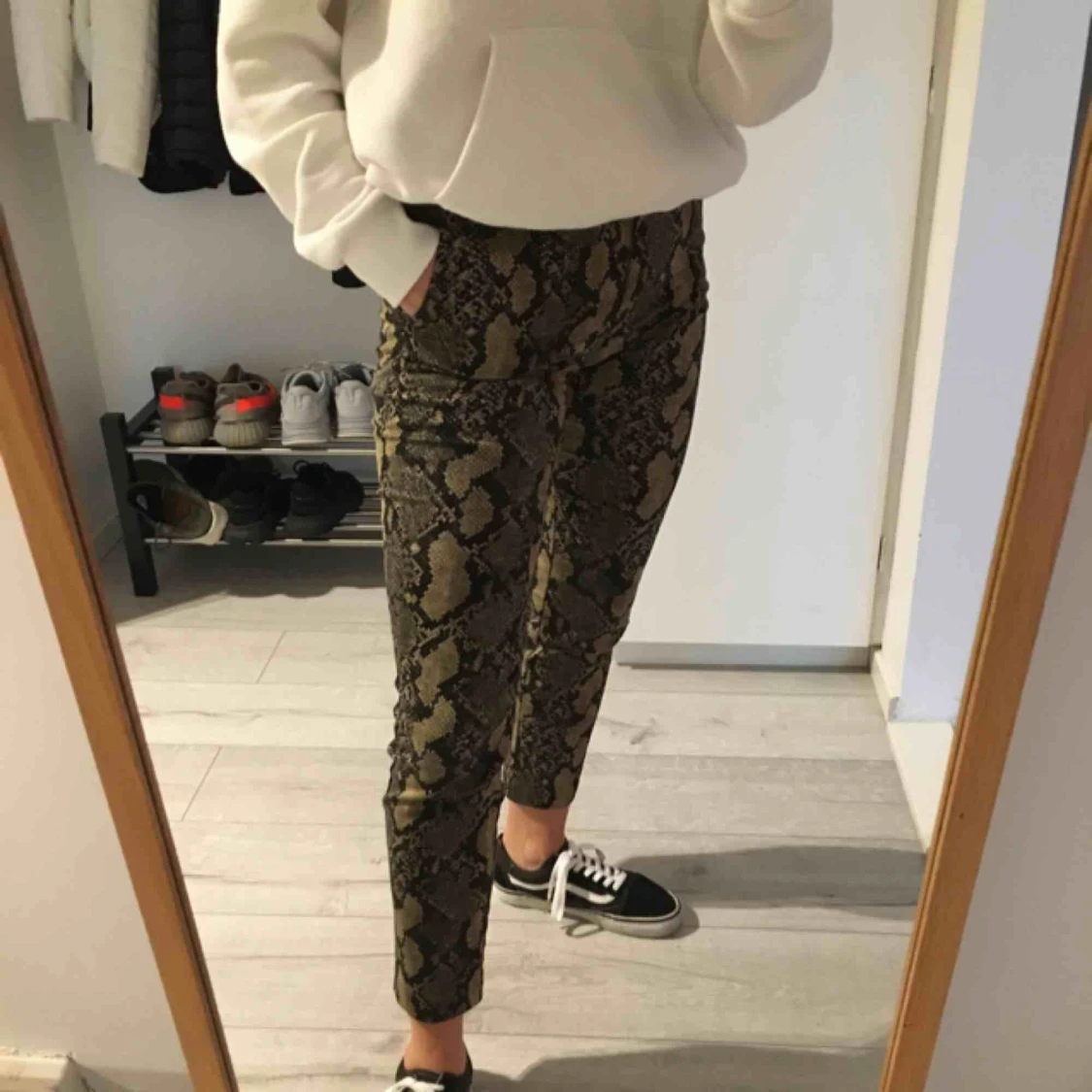 Skitsnygga ankelkorta byxor från hm med ormskinnsprint. 60% shell 30% bomull. Sköna och stretchiga. Använda 2 gånger.