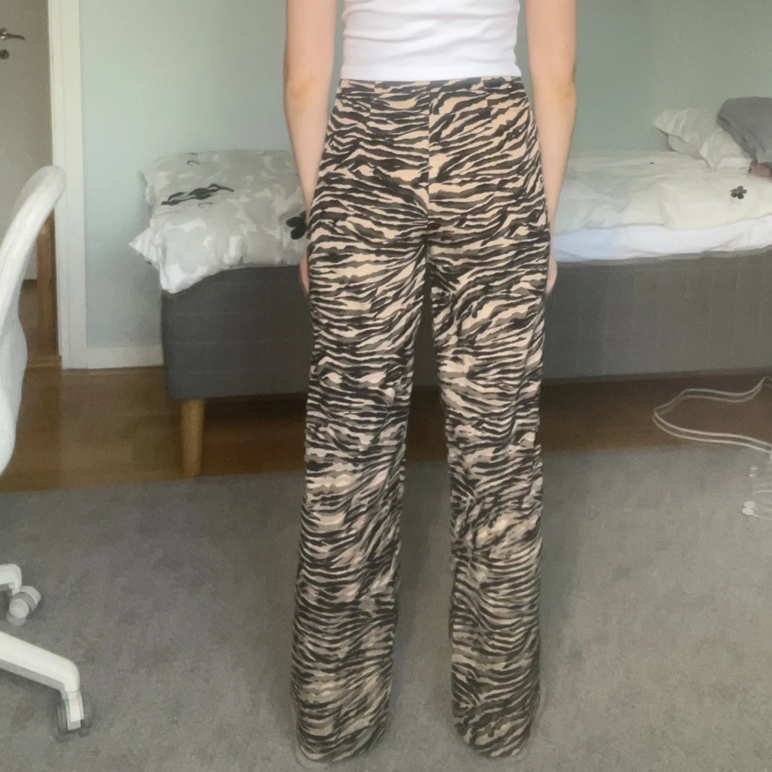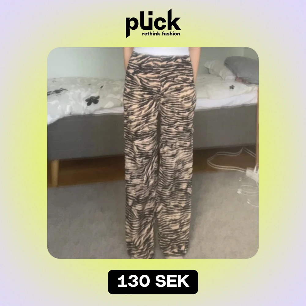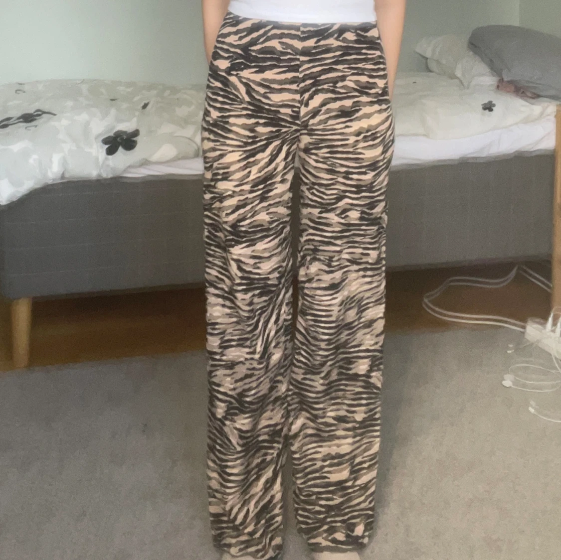 Trendiga tigermönstrade byxor. Midjemåttet är 30 cm, innerbensmåttet är 75 cm och höftmåttet är ca 40-45 cm. Om du undrar något är det bara att fråga.