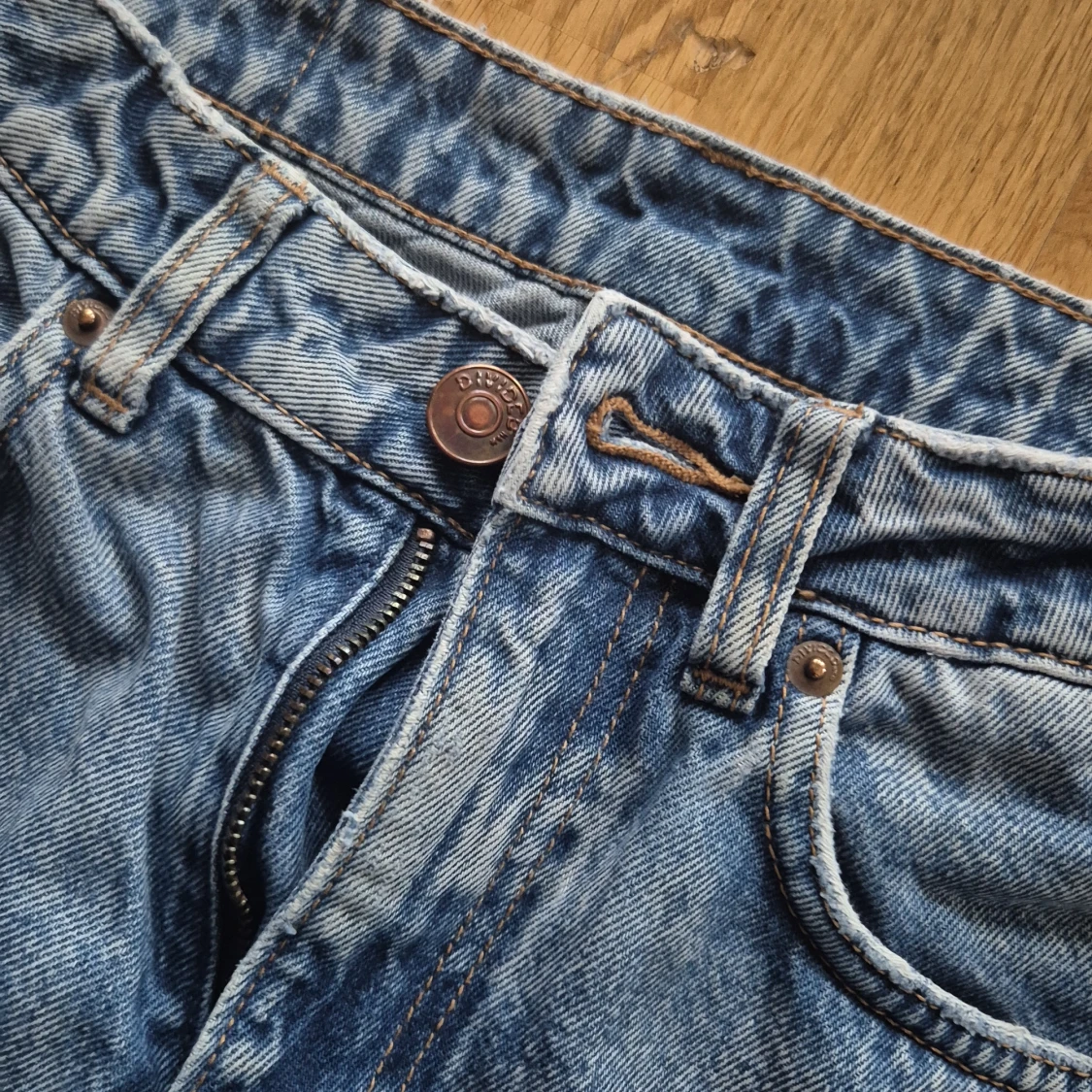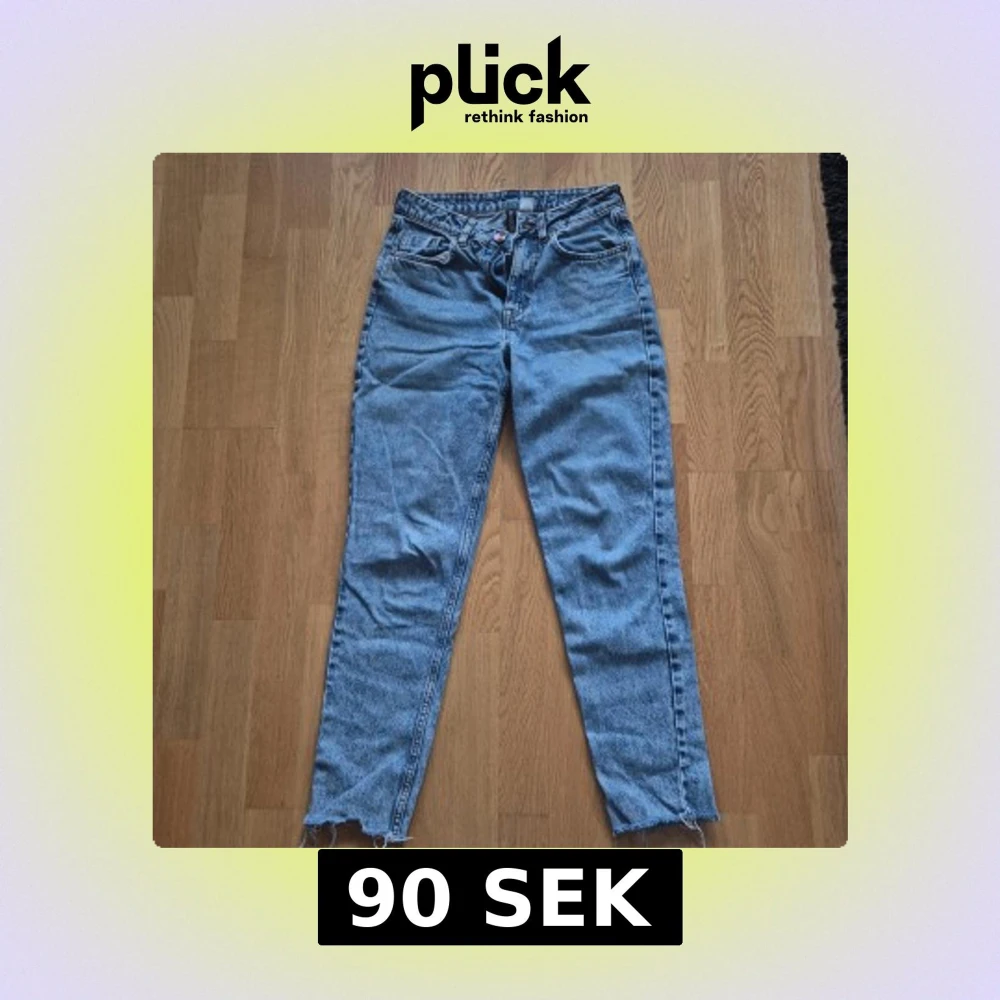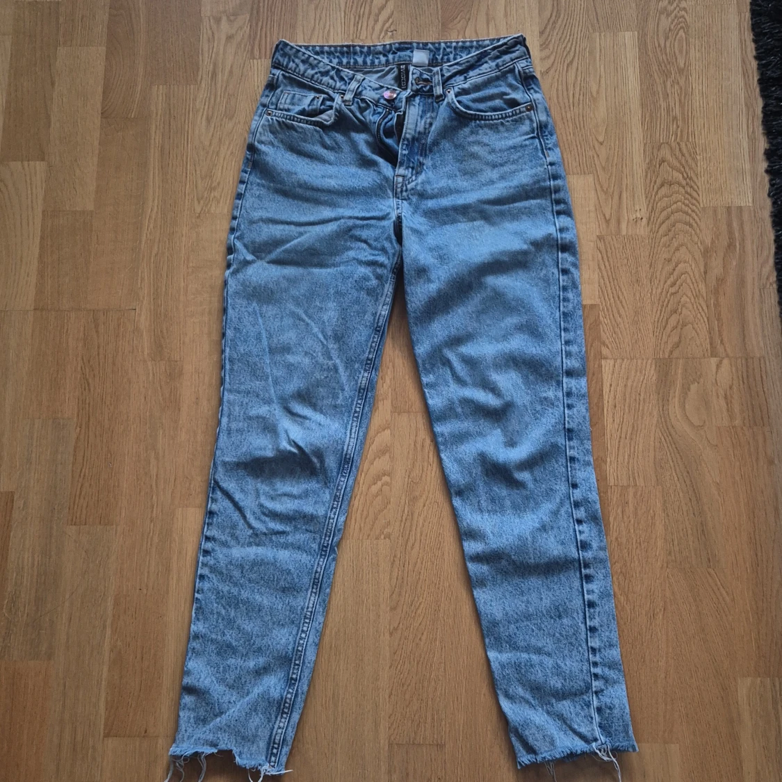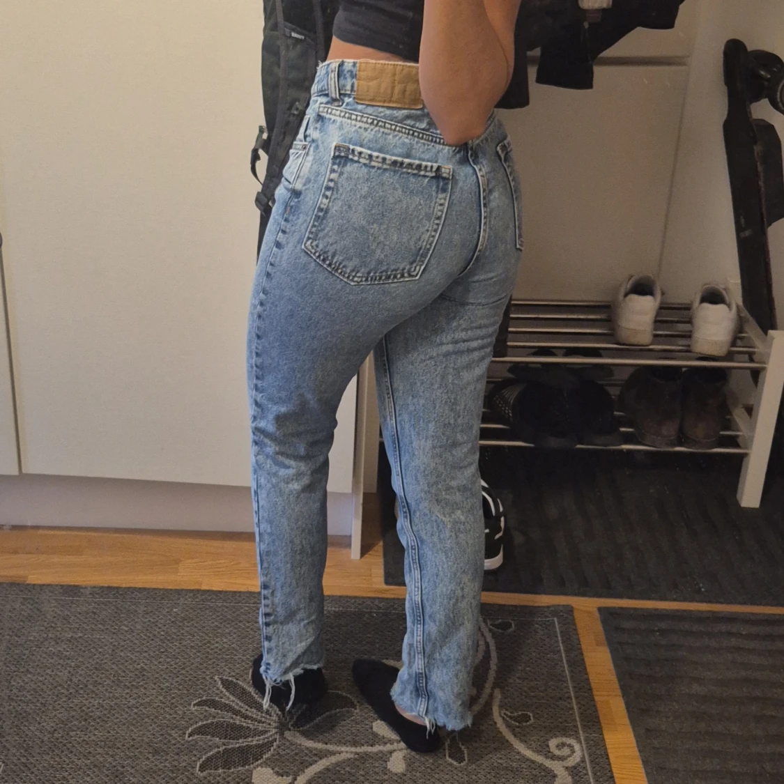 Säljer ett par klassiska blå jeans med raka ben och råa, fransiga benslut. Jeansen har hög midja. Sitter bra på mig som är 154cm. Säljer pga använder ej.