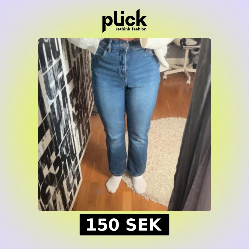 Snygga högmidjade blå jeans, väldigt bekväma. Lite trådar som sticker ut men i det hela inte syns så mycket. Lite slitna och färgen har försvunnit lite där det är ljusare
