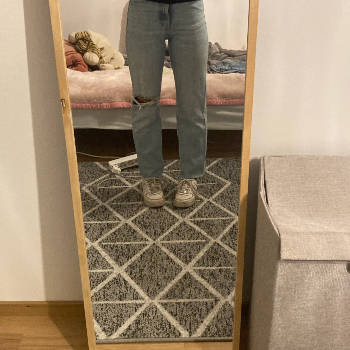 Högmidjade jeans från Zara, jag är 159 och de är ej uppklippta utan det ut så där. Ett hål vid knät. För mer frågor eller mer bilder kontakta gärna mig privat💗