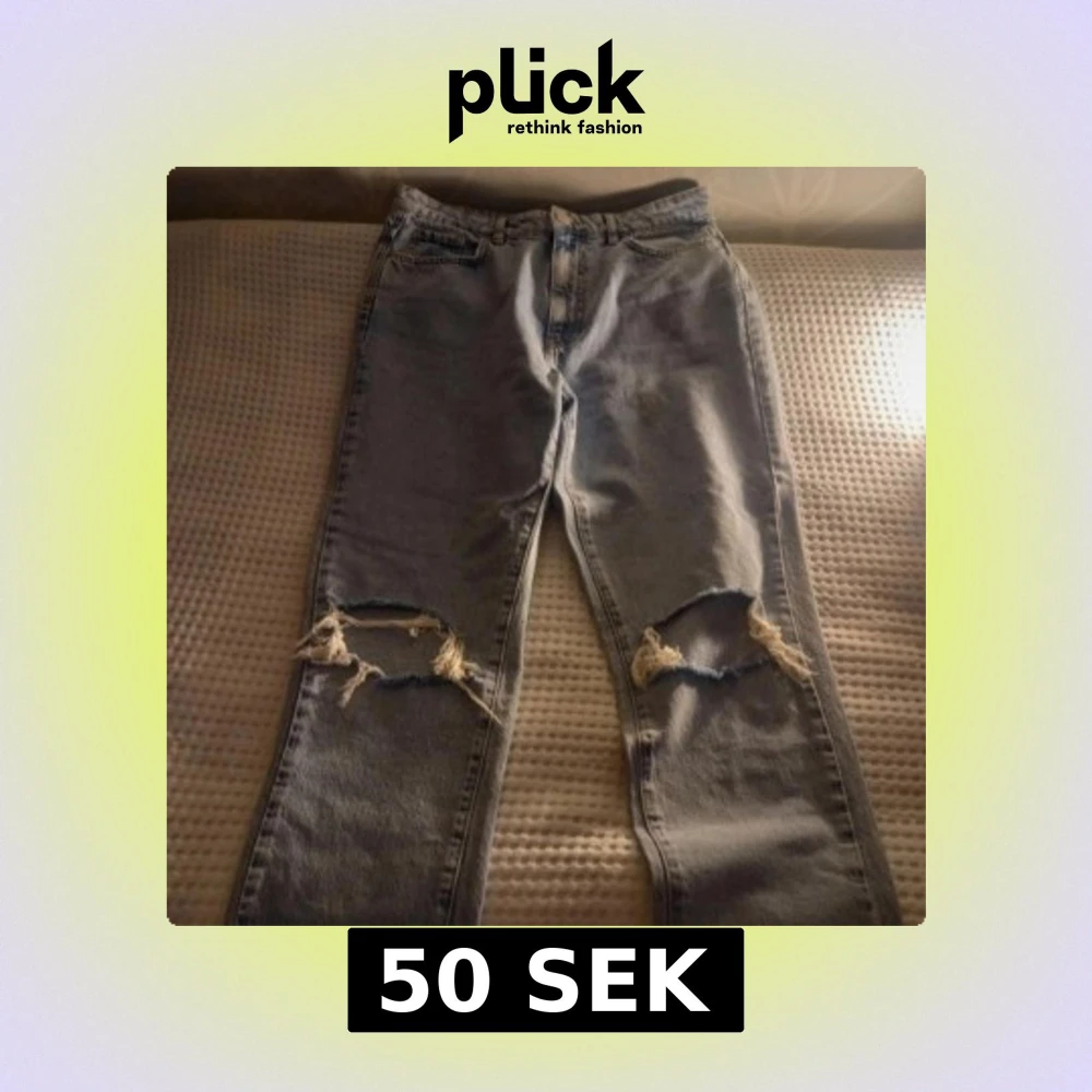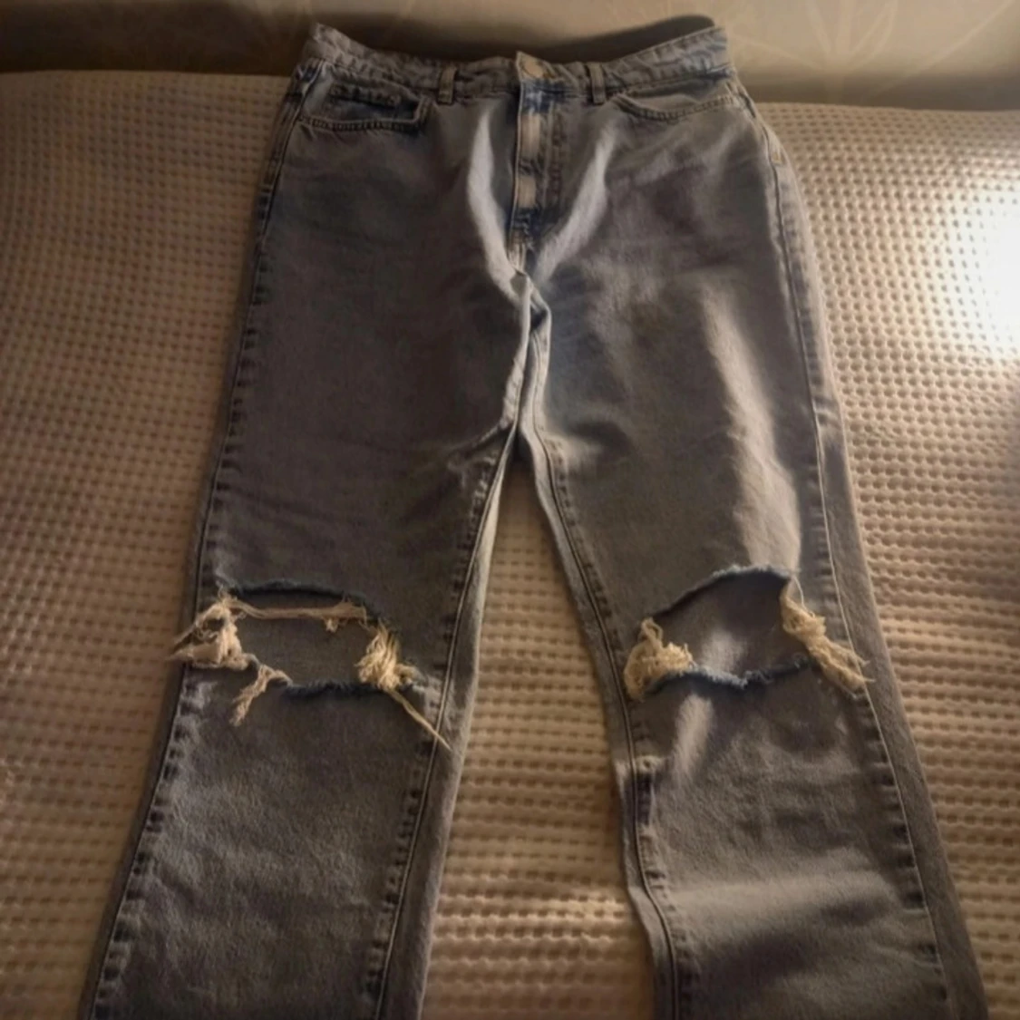 Säljer ett par ljusa jeans med coola slitningar på knäna. De har en klassisk femficksdesign och en knappgylf. Perfekta för en avslappnad stil. Högmidjande jeans