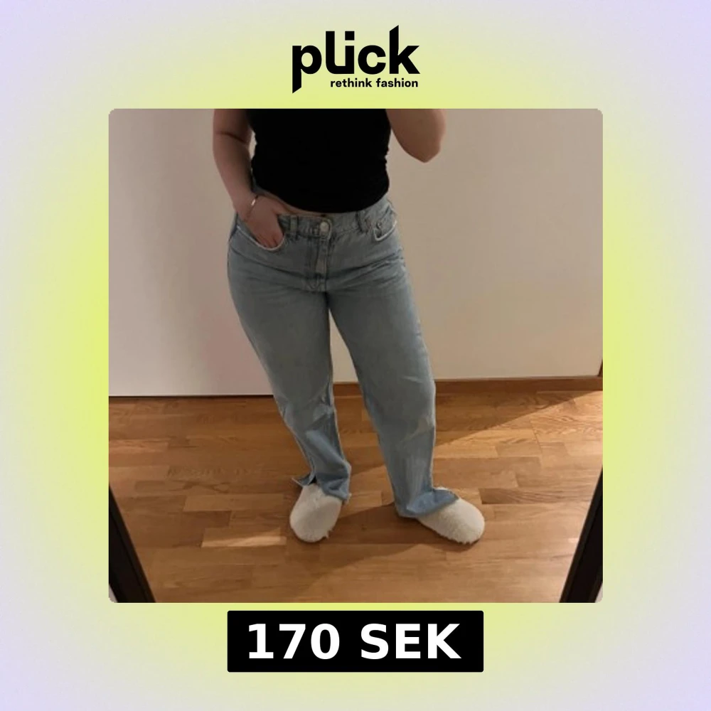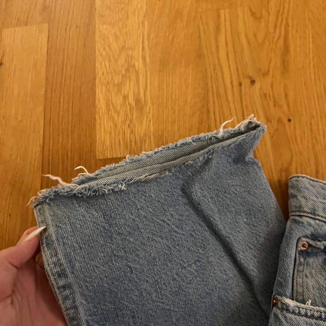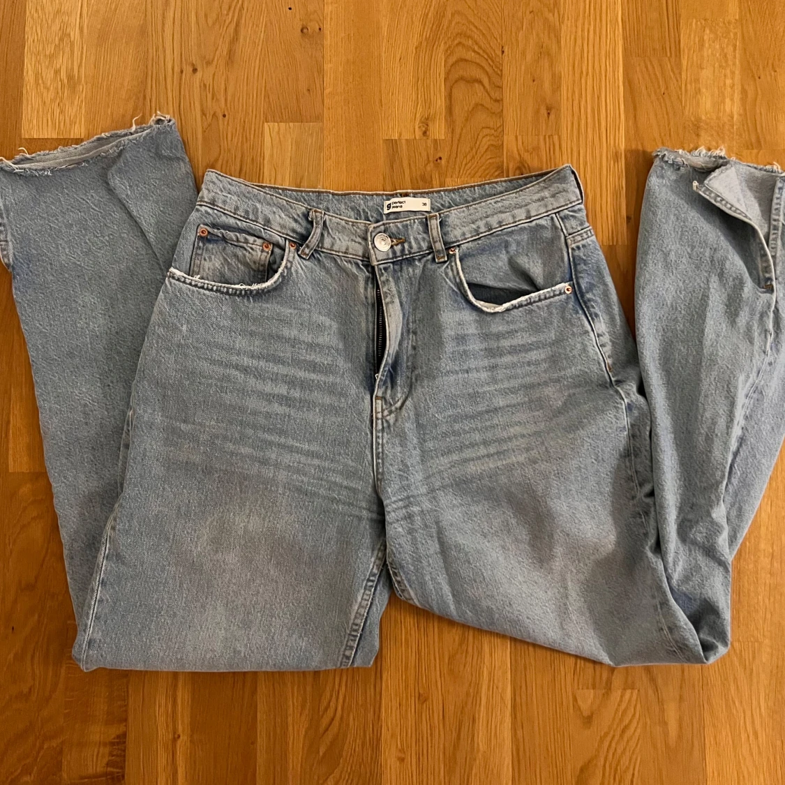 Ljusblåa byxor med slits längst ner från Ginatricot i storlek 38. Dom har hög midja samt är dom avklippta som jag har gjort själv. Jag är 158 cm. Köparen står för frakten 🩷