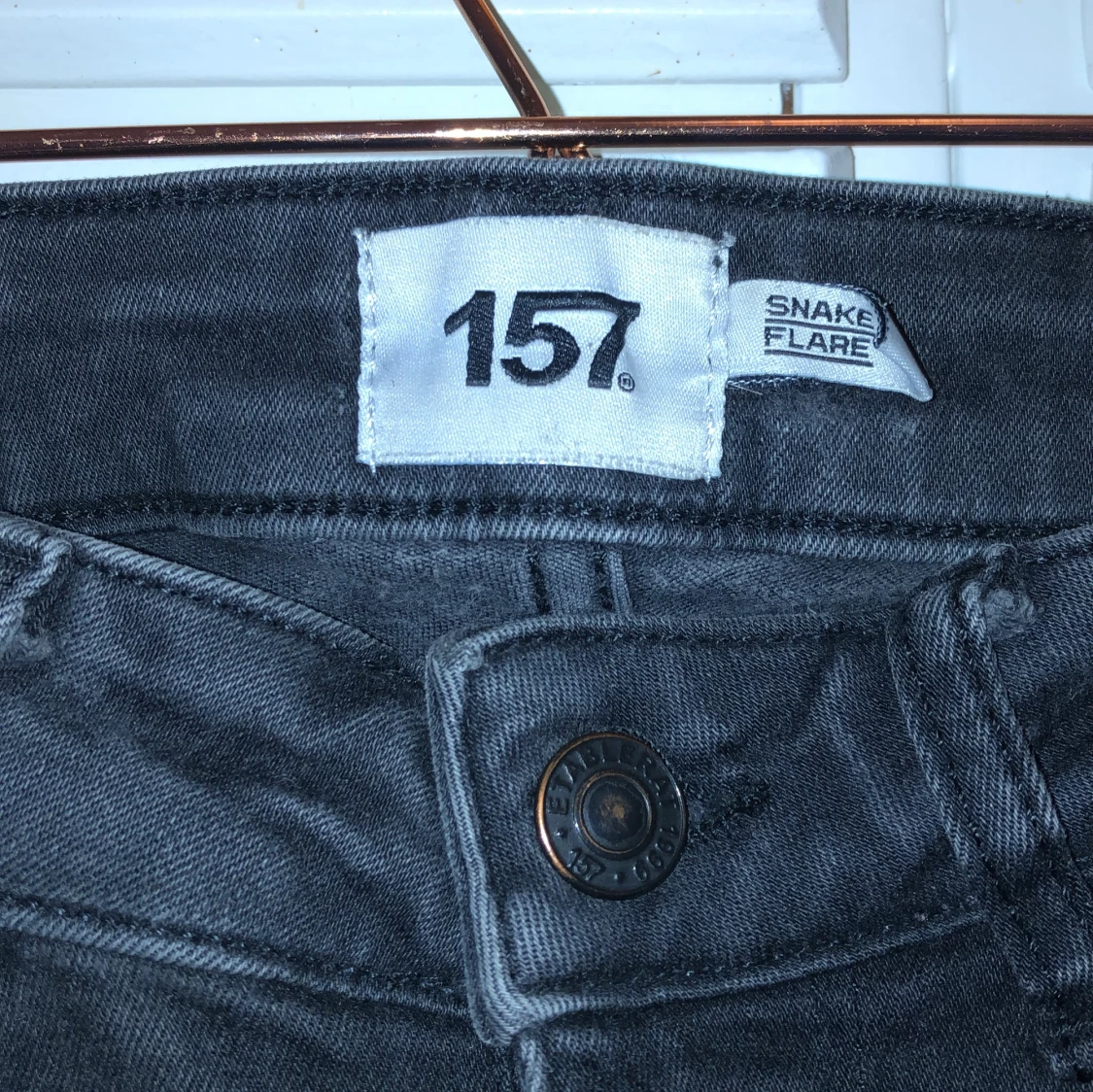 Svarta jeans från 157 i modellen Snake Flare. Högmidjade och utsvängda ben. Jeansen är i stretchigt denimtyg och har knapp- och dragkedjestängning. Lite slitage längst ner vid högra benet. Se bild. Annars bra skick!!