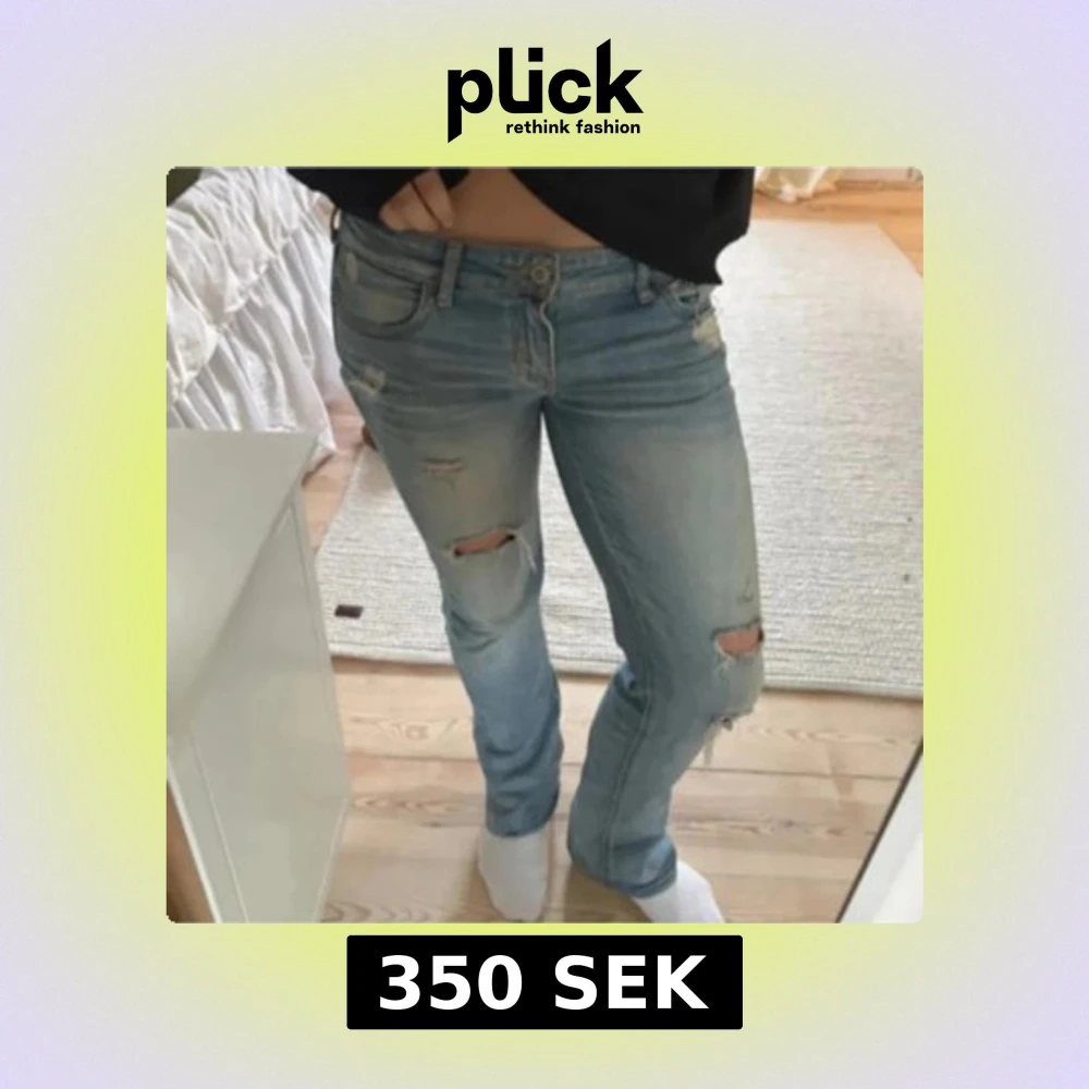 Snygga och unika lågmidjade jeans med slitningar på knäna och låren. hon jag köpte dem av har sytt ut de med en liten kil på sidorna men ingenting som syns. De är bootcut/ straight med låg midja. Super snygga passar allt. lägger ut dem då dem tyvärr var för stor i midjan för mig. hör av er vid frågor. (LÅNADE BILDER!!!)