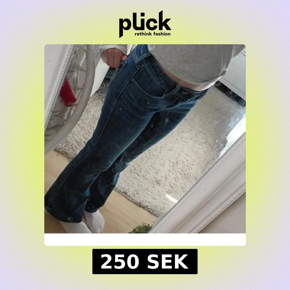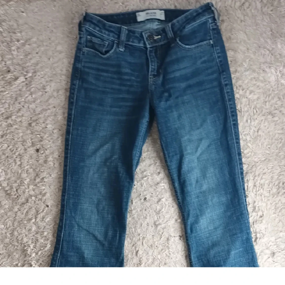 Snygga blå jeans från Hollister med klassisk bootcut-modell och låg midja. Jeansen har fem fickor, bälteshällor och stängs med dragkedja och knapp. Perfekt tvättad denim med lätt slitning för en cool look.