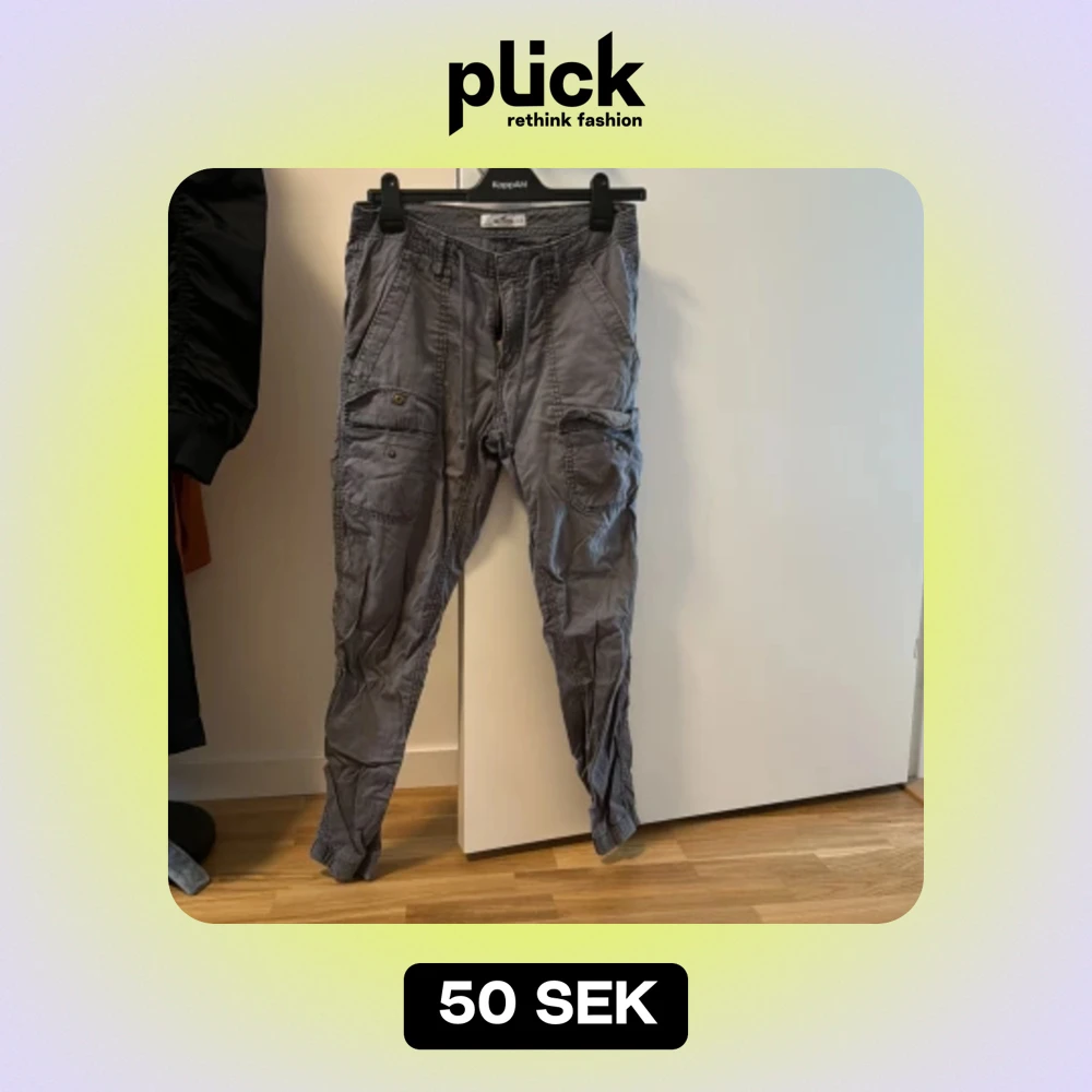 Säljer mina gråa Cargobyxor från Hollister. Storlek 26, och man kan spänna de där uppe med hjälp av snören som finns i byxorna.