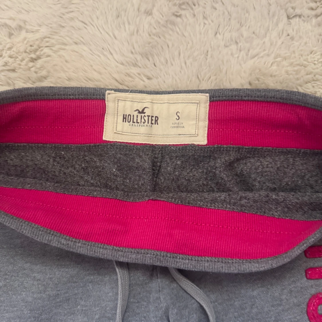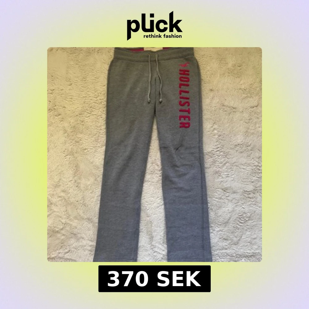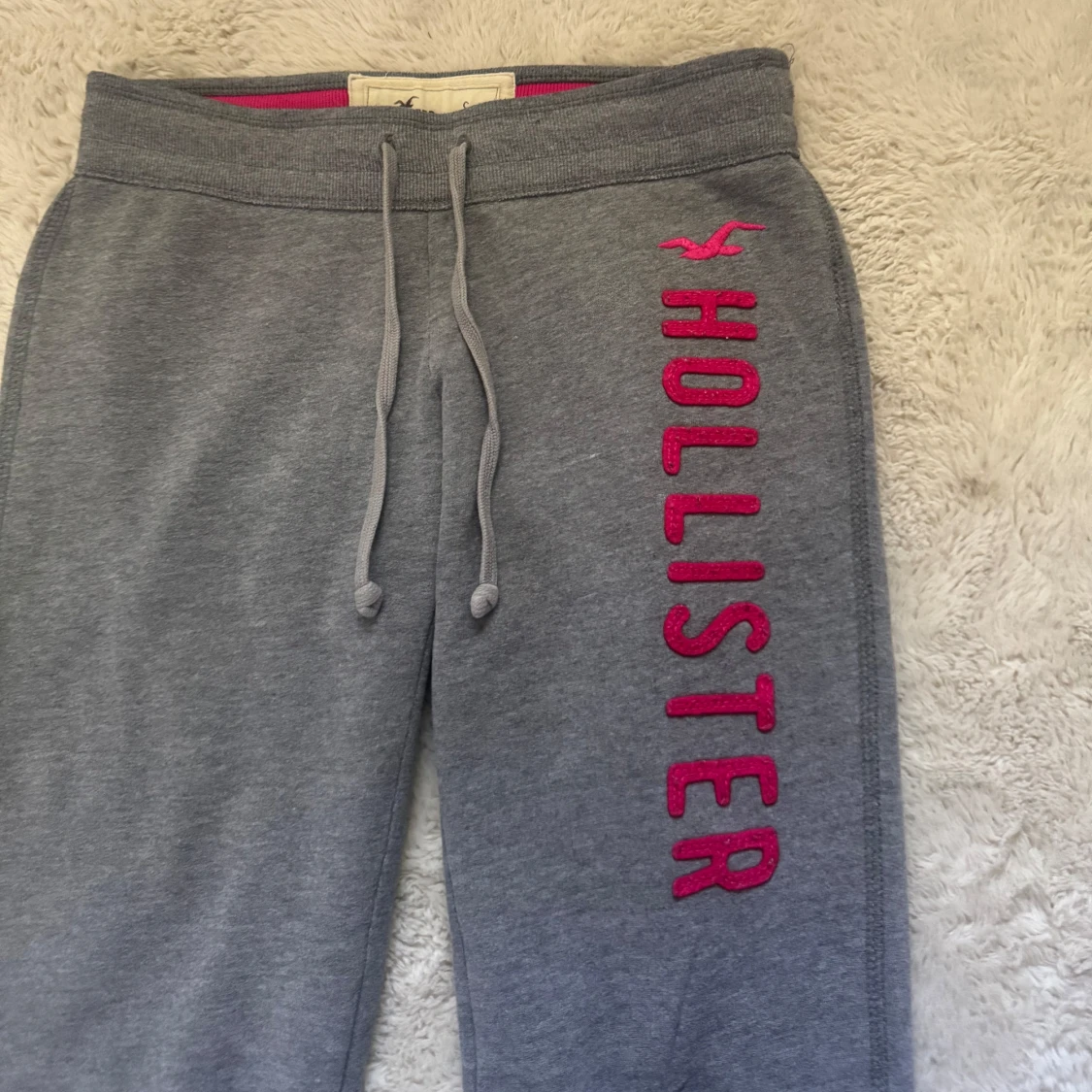 Grå mjukisbyxor från Hollister med rosa logga längs benet. Byxorna har dragsko i midjan och är fodrade med mjukt tyg på insidan. Perfekta för chill dagar och har en avslappnad passform.