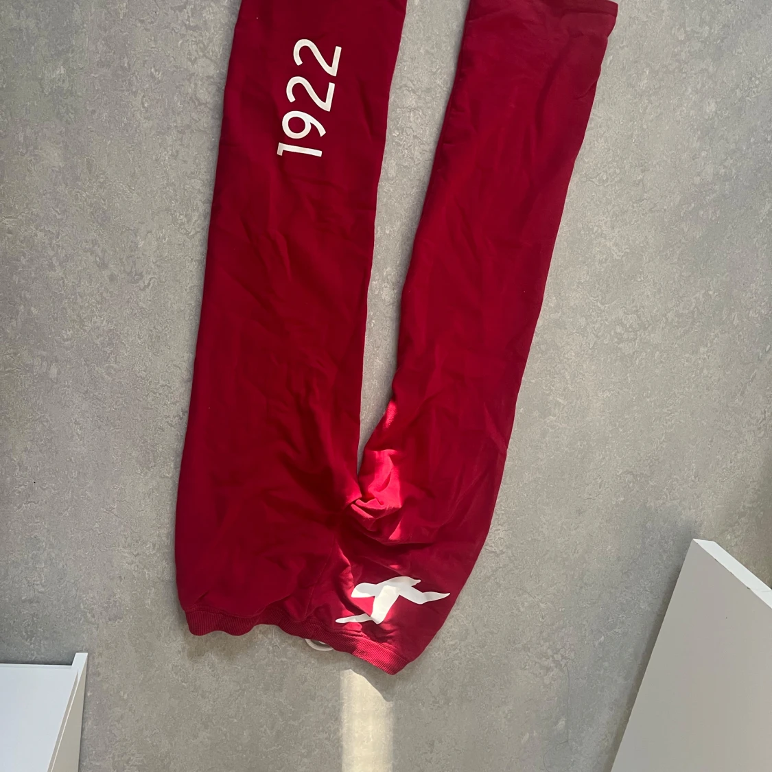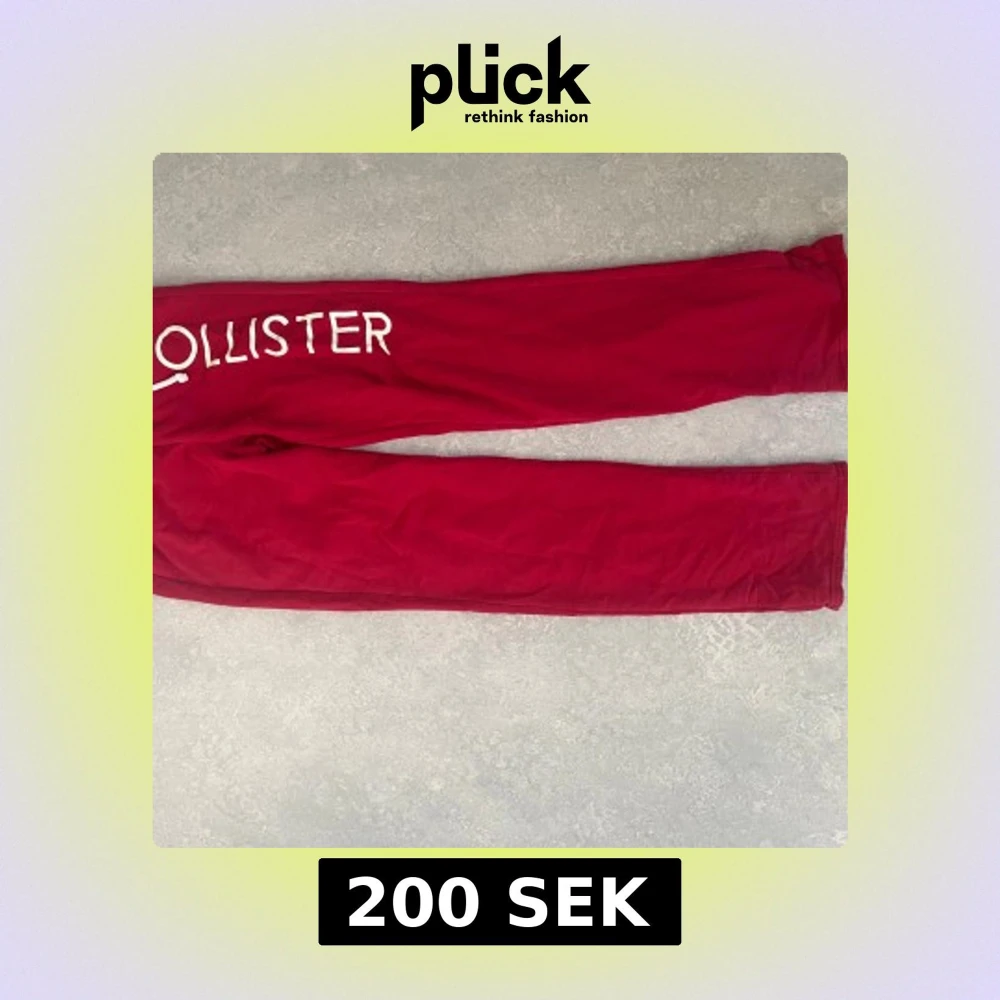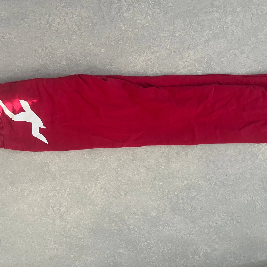 Snygga röda mjukisbyxor från Hollister med vit logga och siffrorna '1922' tryckta på sidan. Perfekta för en avslappnad stil. Byxorna har en bekväm passform och är gjorda i mjukt material.