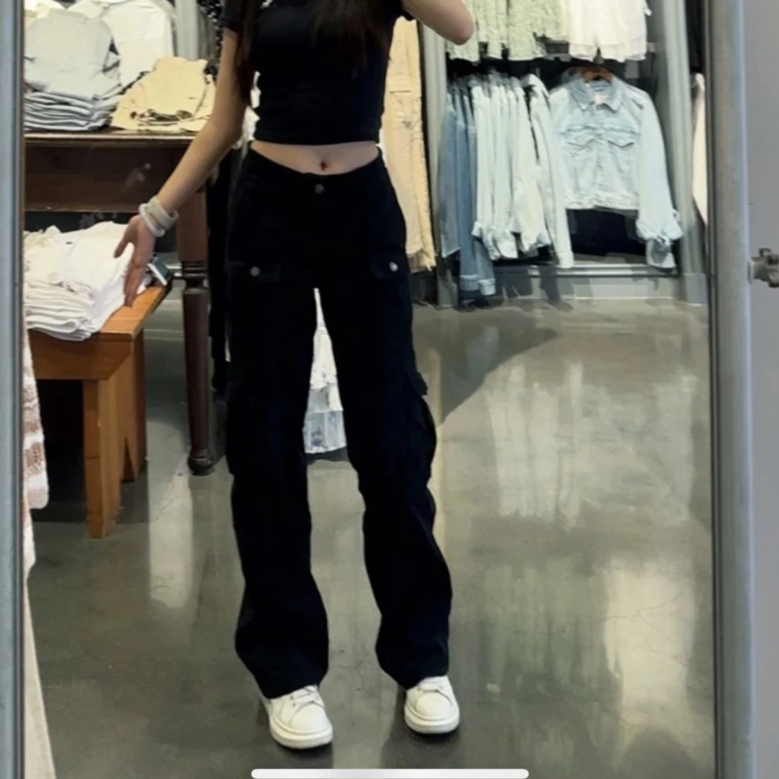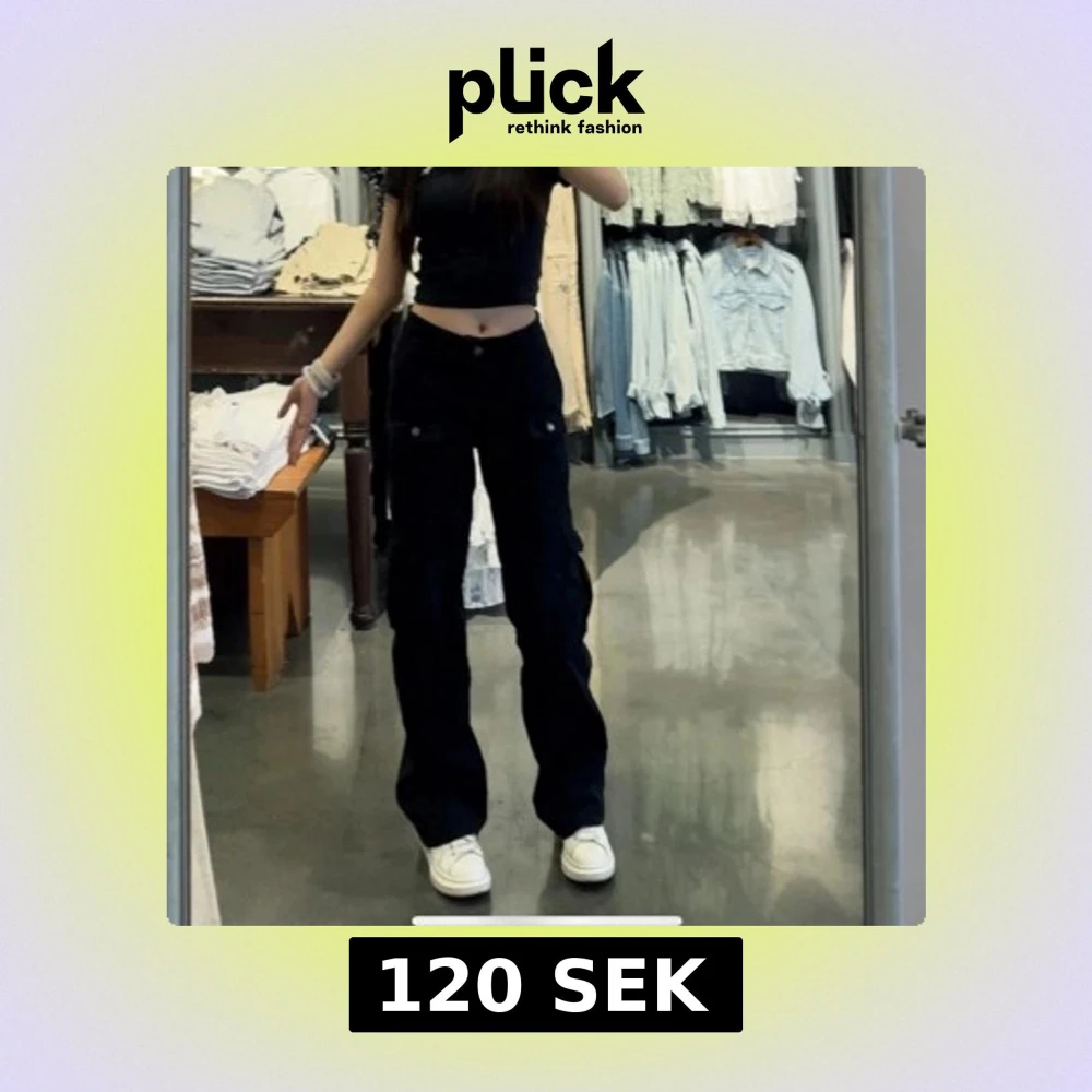 Säljer ett par svarta cargopants med flera fickor på benen och avslappnad passform. Byxorna har raka ben och knappar vid fickorna. Från hollsiter och är i storlek 00-R som motsvarar S/34 ish