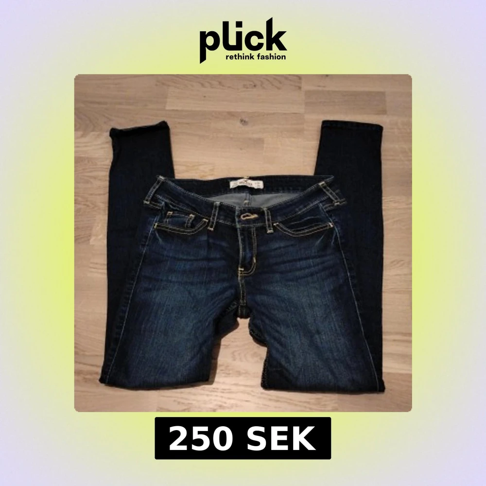 Snygga mörkblå skinny jeans från Hollister med klassiska kontrastsömmar och broderade bakfickor. Modellen har låg midja och smal passform hela vägen ner. Perfekta till sneakers eller boots.