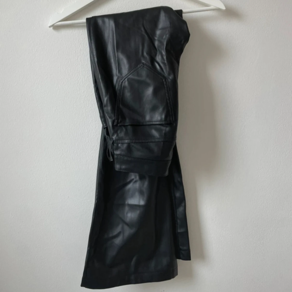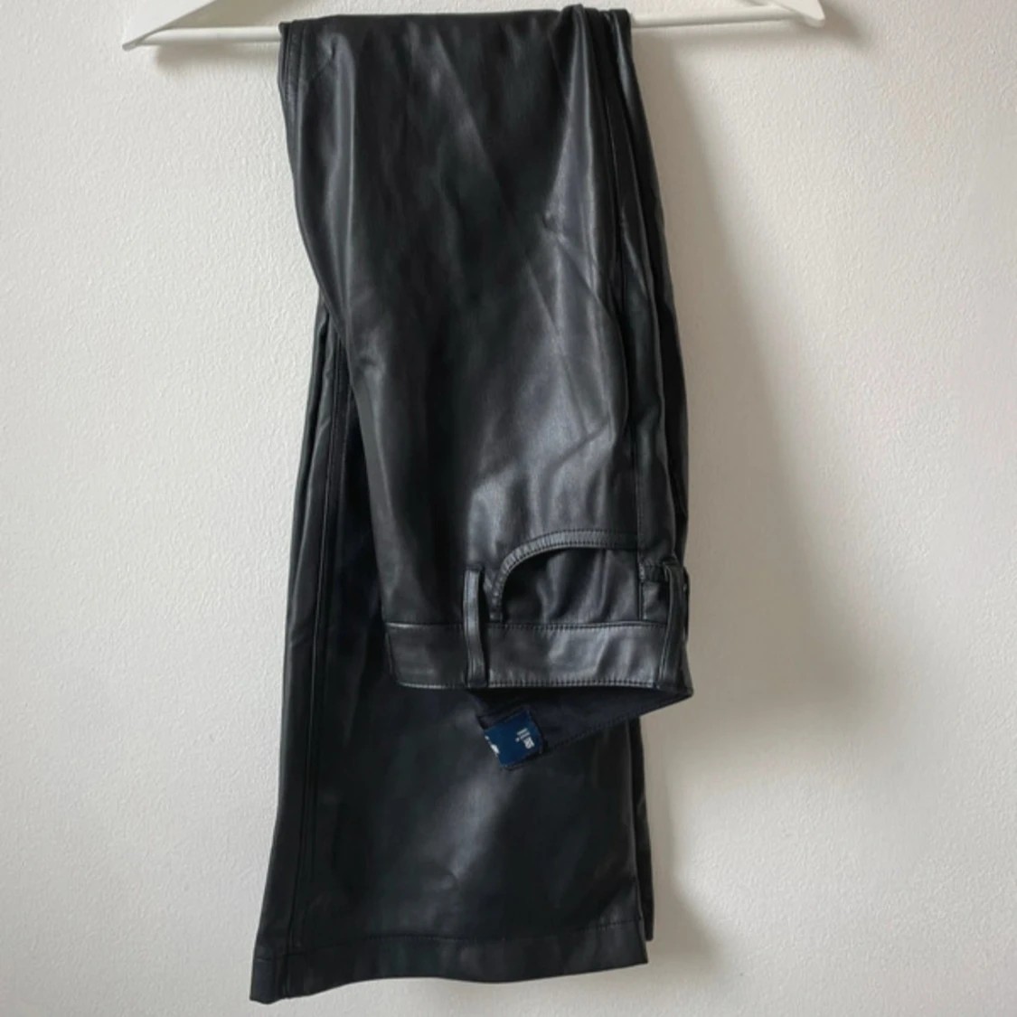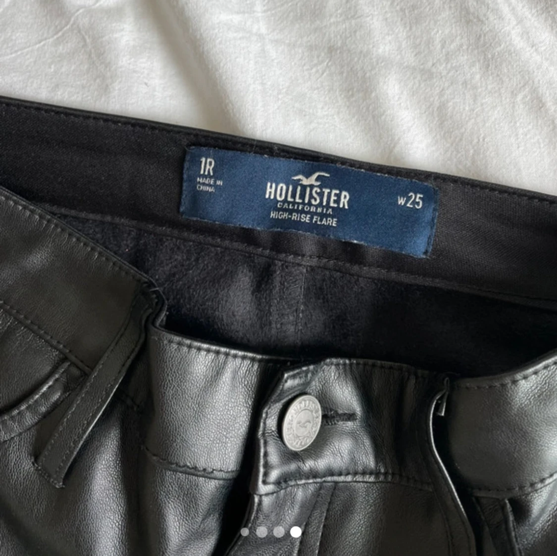 Obs första 2 bilderna inte mina!Snygga svarta byxor i skinnimitation med hög midja och bootcut-ben. De har klassiska fickor bak och fram, samt en figurnära passform upptill som blir vidare nedtill. Perfekta för dig som vill sticka ut med en edgy look. Aldrig använda. Byxor från Hollister i imitationsläder / Lack. Mjukt material inuti. Utsvängda. Långa och fina på mig som är 168cm. OBS W25. Jätte fina på!