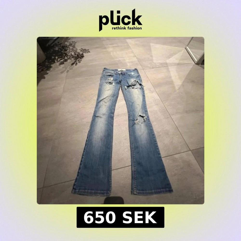 snygga håliga jeans från Hollister, säljs inte längre !! bilder är från gamla ägare då dessa har blivit för små (därför jag säljer) 💓 mått: midjemått: ca 35cm rakt över, innerbenslängd: ca 76cm