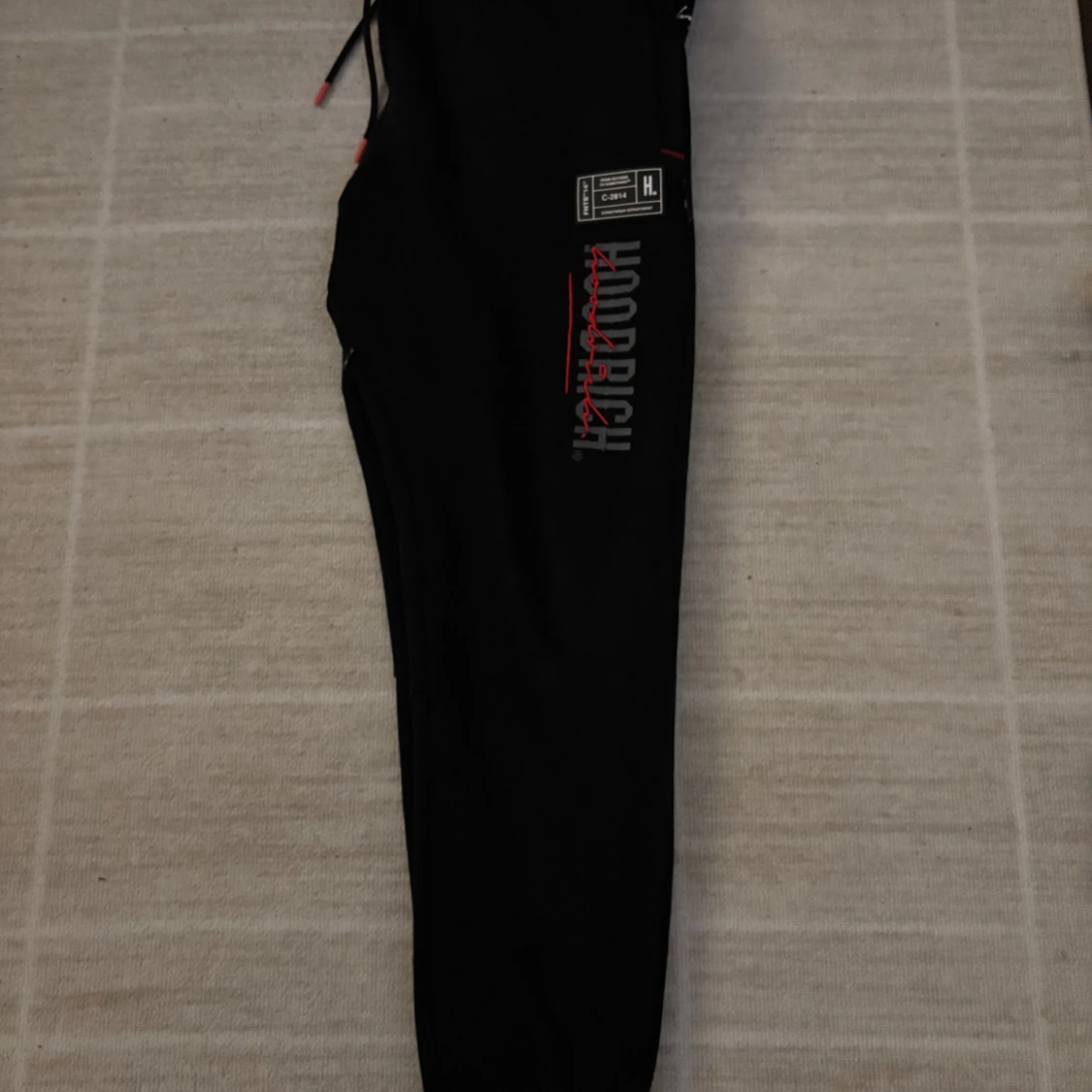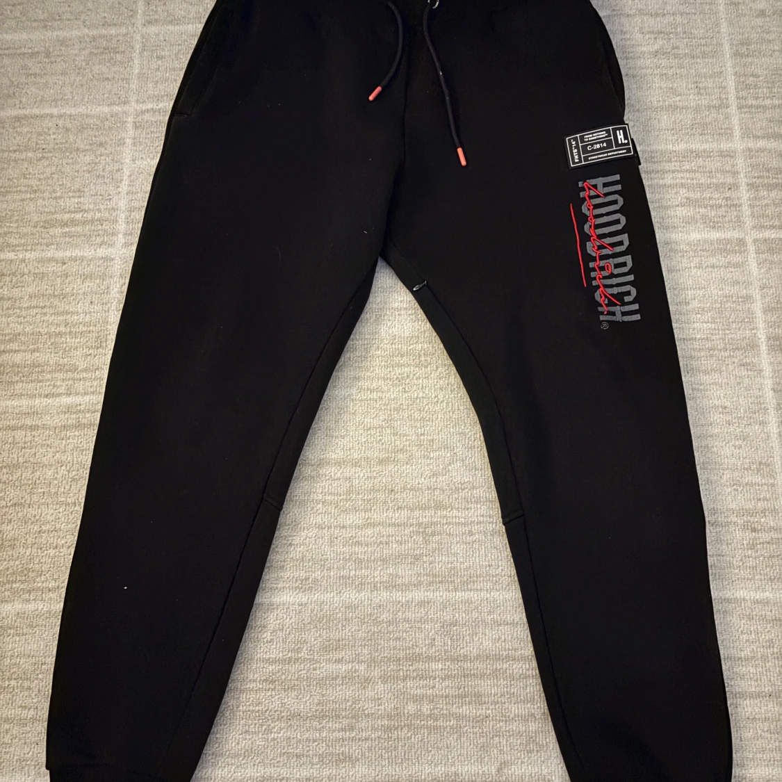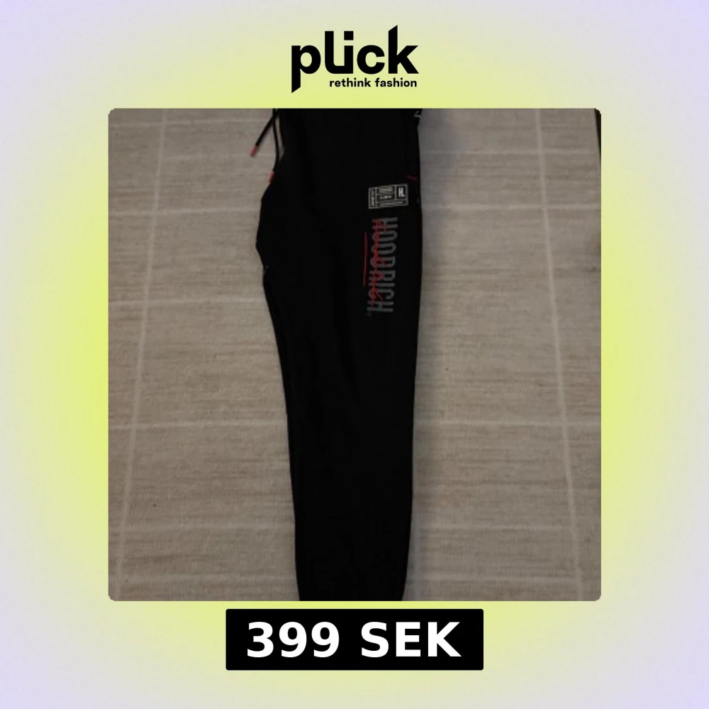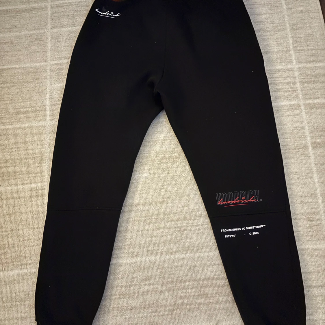 Snygga svarta mjukisbyxor från Hoodrich med tryck i vitt och rött. Byxorna har en elastisk midja med snörning och muddar vid bensluten. Perfekta för en avslappnad stil. Riktigt bekväma och snygga.
