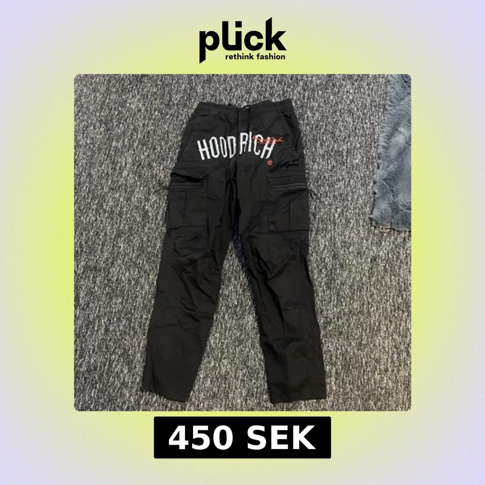 Snygga svarta cargobyxor från Hoodrich med elastisk midja och flera praktiska fickor. Perfekta för en avslappnad stil med en touch av streetwear. Byxorna har en cool logga på baksidan och är tillverkade i ett slitstarkt material.
