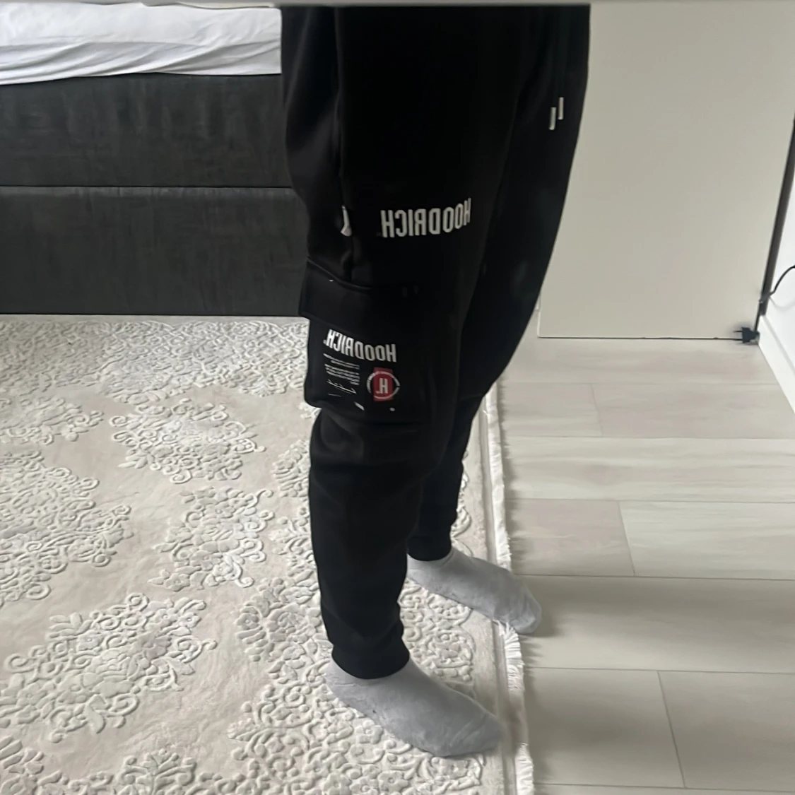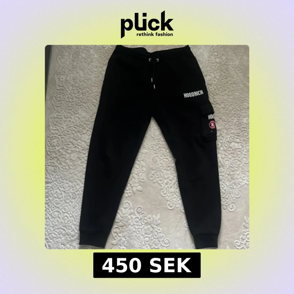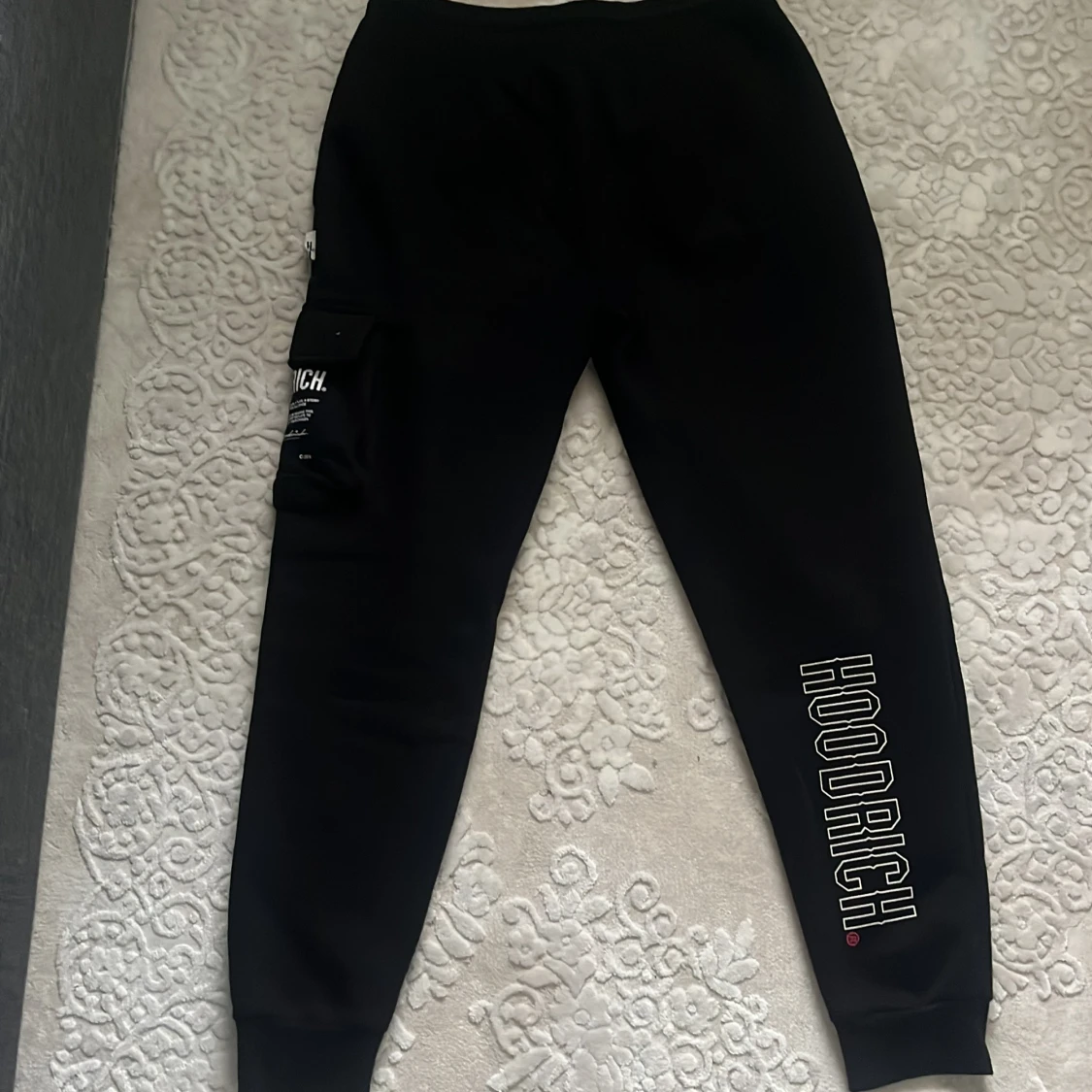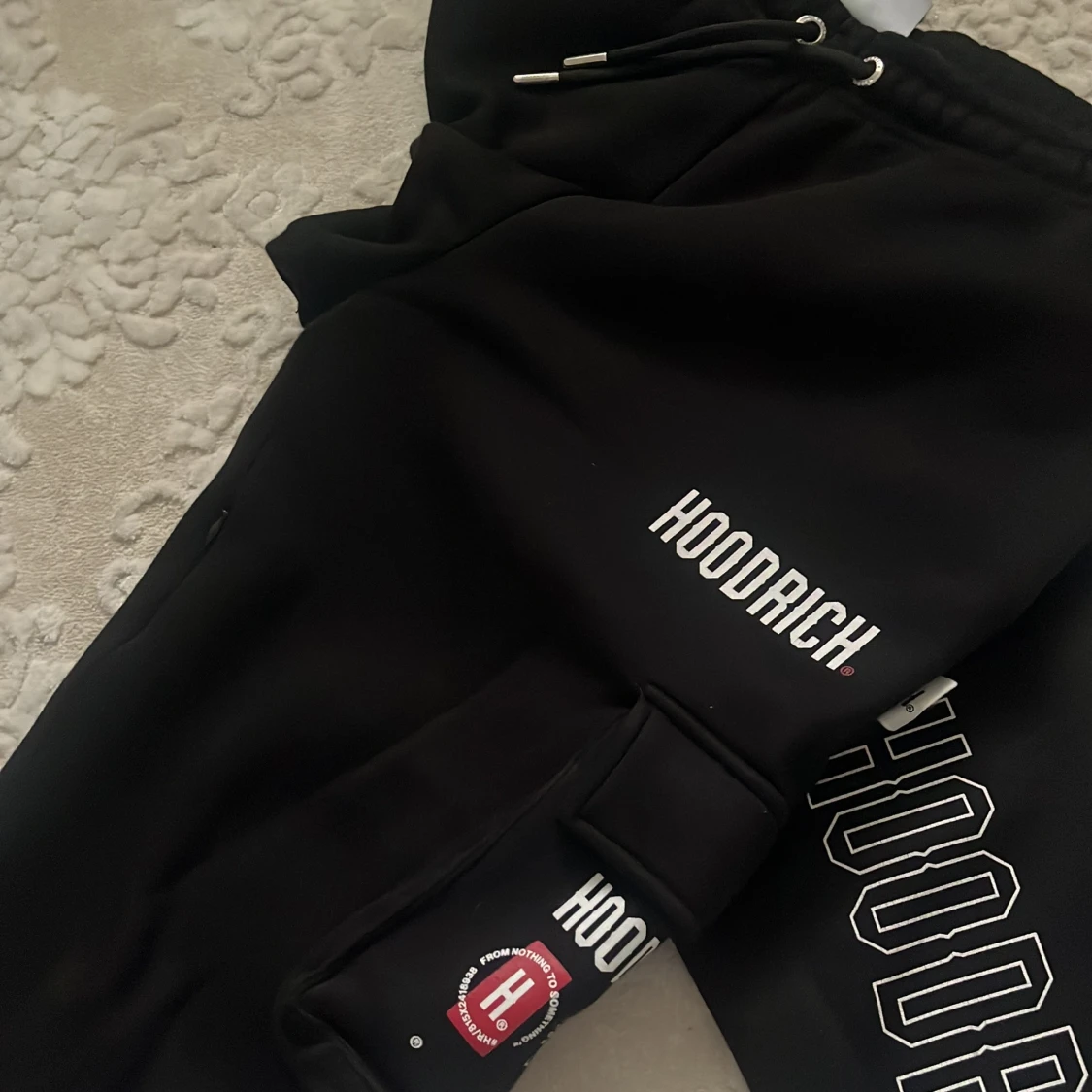 Svarta mjukisbyxor från Hoodrich med vit logga på benet och fickan. Byxorna har snörning i midjan, elastiska muddar vid benslut och en stor ficka på sidan med tryck. Den har även en ficka med dragkedja intill benet. Mjukisbyxorna är värkligen super mjuka och sköna. Tillverkade i mjuk bomullsblandning för skön passform.