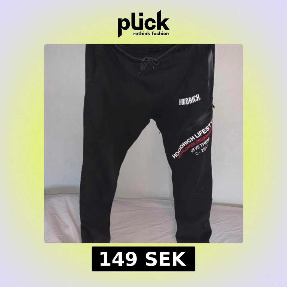 Snygga svarta mjukisbyxor från Hoodrich med tryck i vitt och rött. Byxorna har en bekväm passform med snörning i midjan och en dragkedja på sidan. Perfekta för en avslappnad stil.