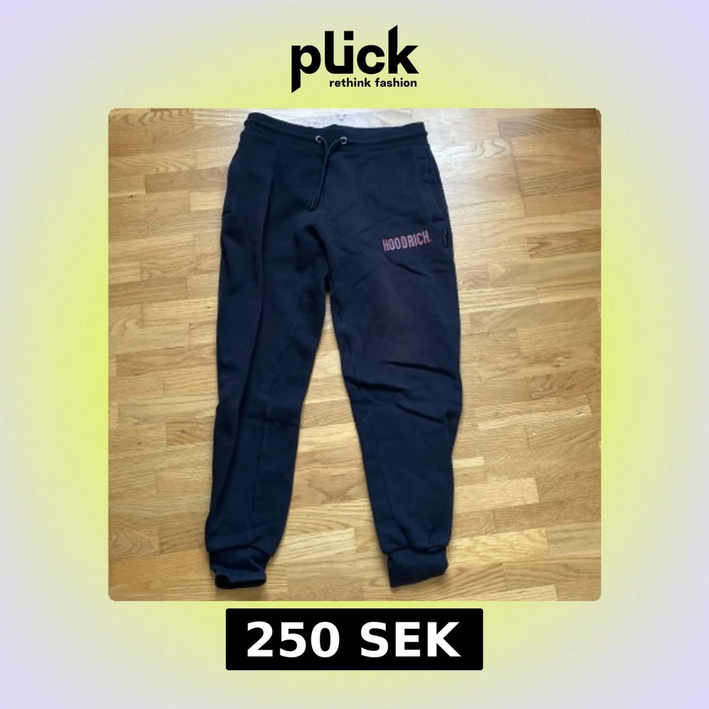 Svarta mjukisbyxor från Hoodrich i storlek S. Byxorna har dragsko i midjan, ribbade muddar vid bensluten och HOODRICH-logga i rött och vitt på låret. Perfekta för chill eller streetwear. Mjukt material och fickor med dragkedja.