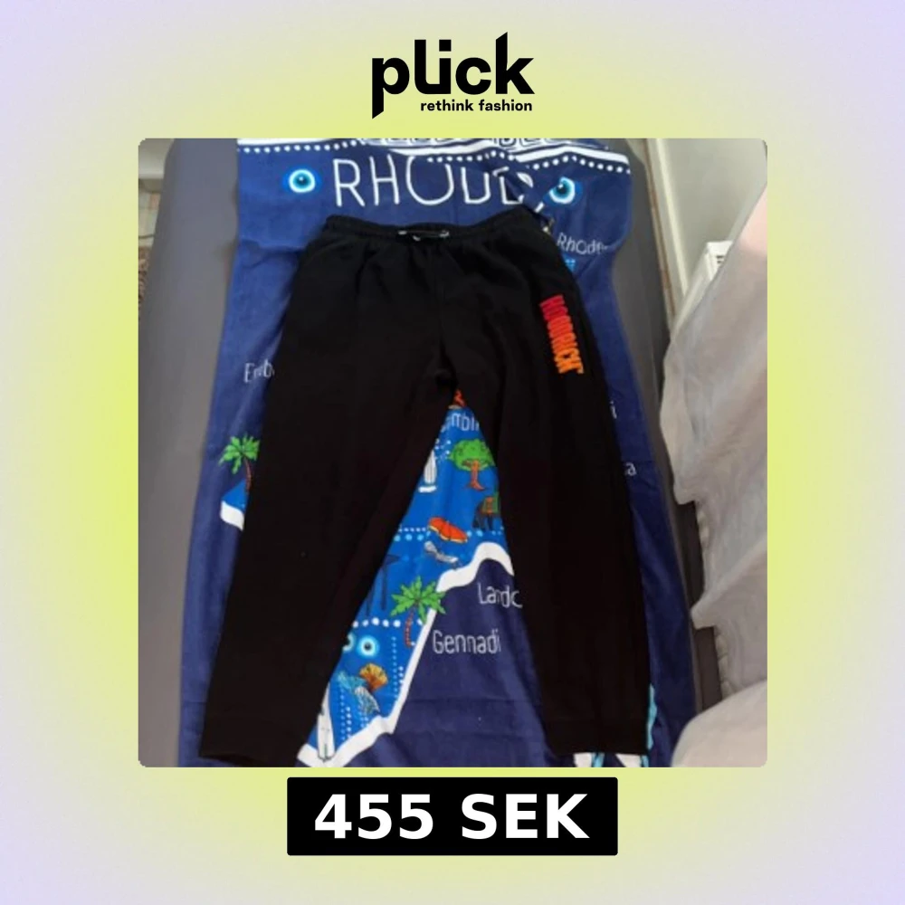 Svart hoodrich byxa med ett stort orang märke vid toppen av det vänstra benet. Priset kan förhandlas om du inte är nöjd och jag brukar skicka ut mina paket via PostNord eller instabox och jag brukar skicka ut paketet samma dag som du köpte