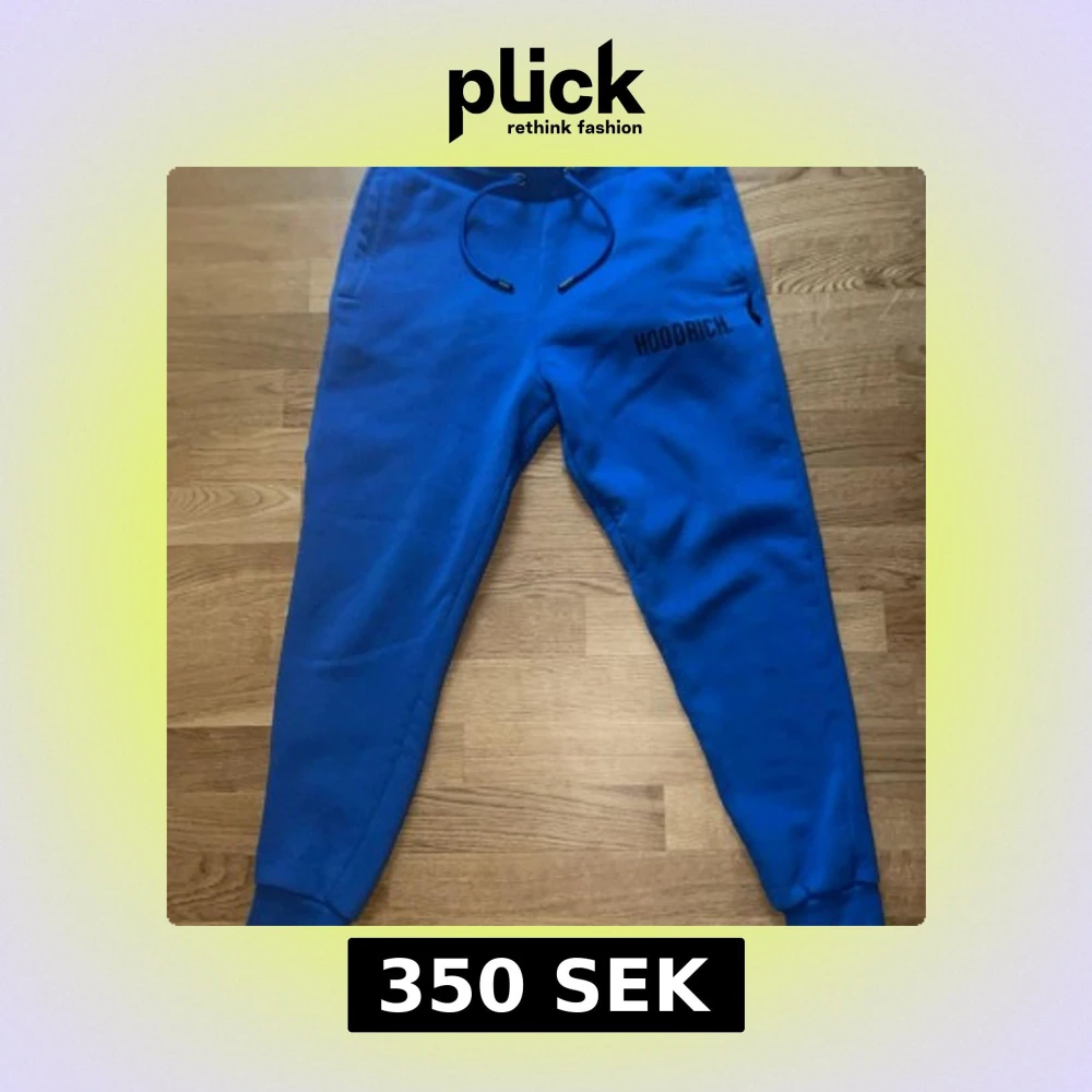 Snygga blå mjukisbyxor från Hoodrich med svart logga på låret. Byxorna har resår och snörning i midjan samt muddar vid bensluten. Perfekta för en avslappnad stil och riktigt sköna att ha på sig.