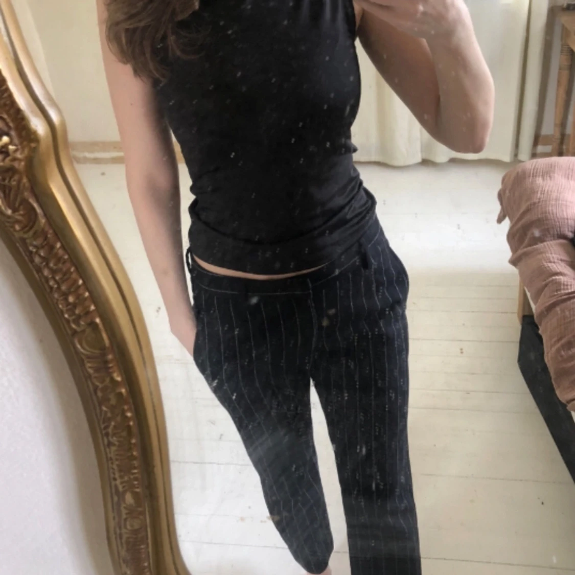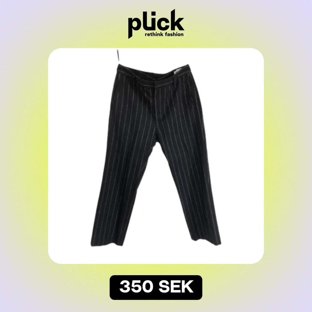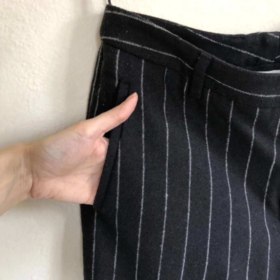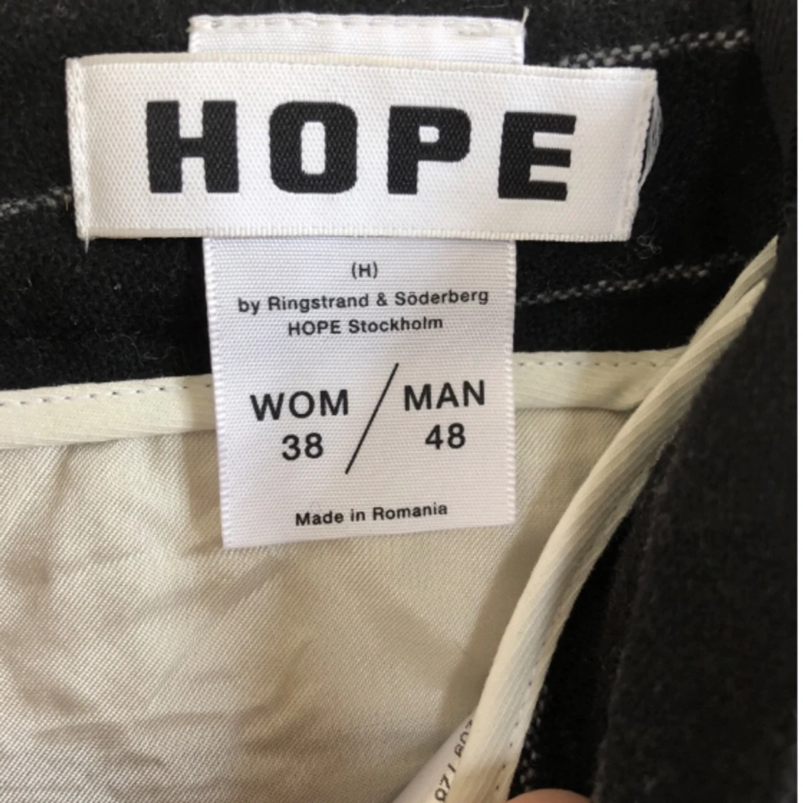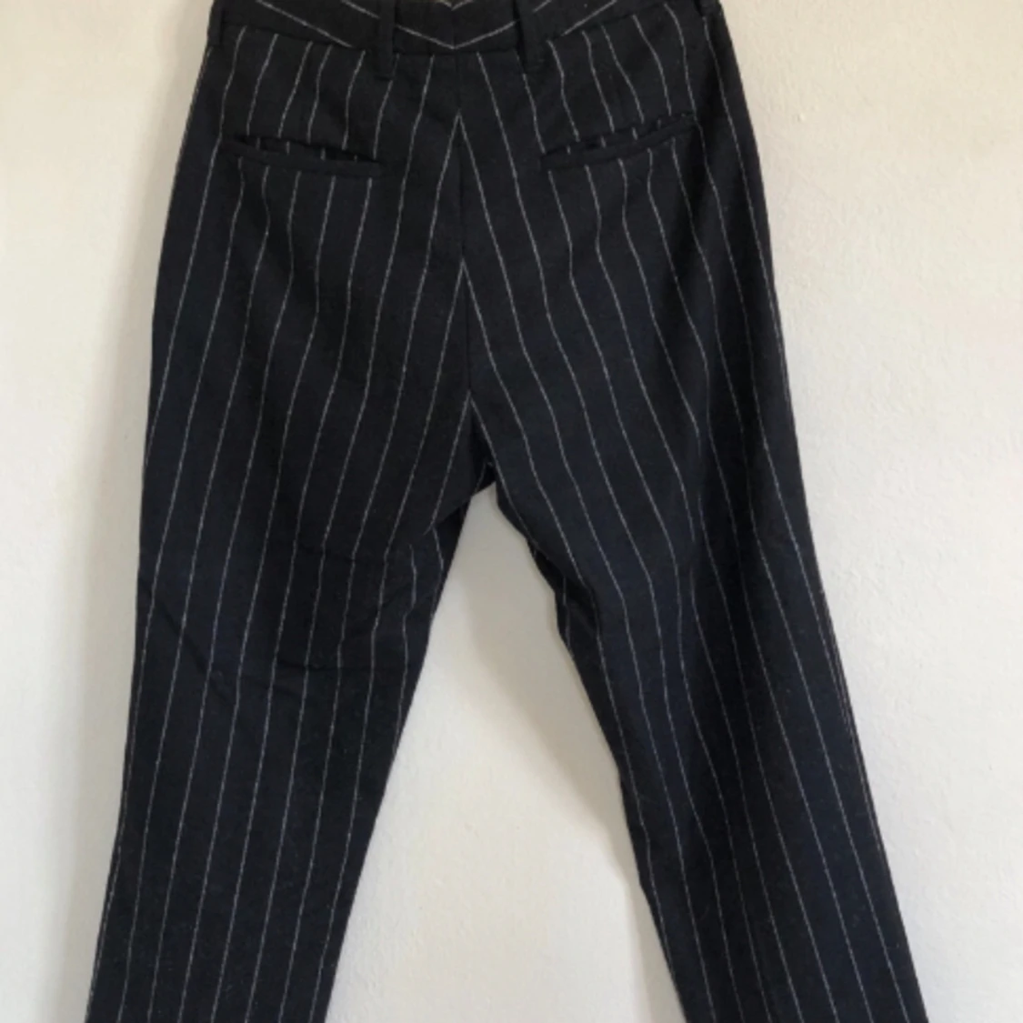 Pinstripe pants from Swedish brand HOPE. These are unisex. I wear size 26 in jeans and these fit me a little bit loose. They are mid rise and are slightly cropped at ankle. Very well made and in mint condition :) Made of: 55% Wool 30% Polyester