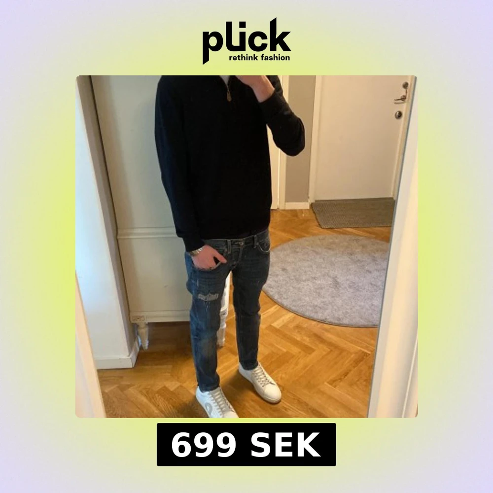 Snygga blå jeans från Dondup Geoerge jeans med coola slitningar och detaljer på både fram- och baksida. Klassisk femficksmodell med kontrastsömmar och låg midja. Jeansen är tillverkade i jeansmaterial med en rå och avslappnad vibe. Köpta för 2299 säljer för endast 699