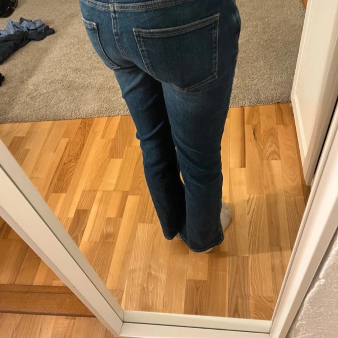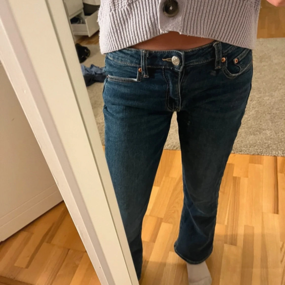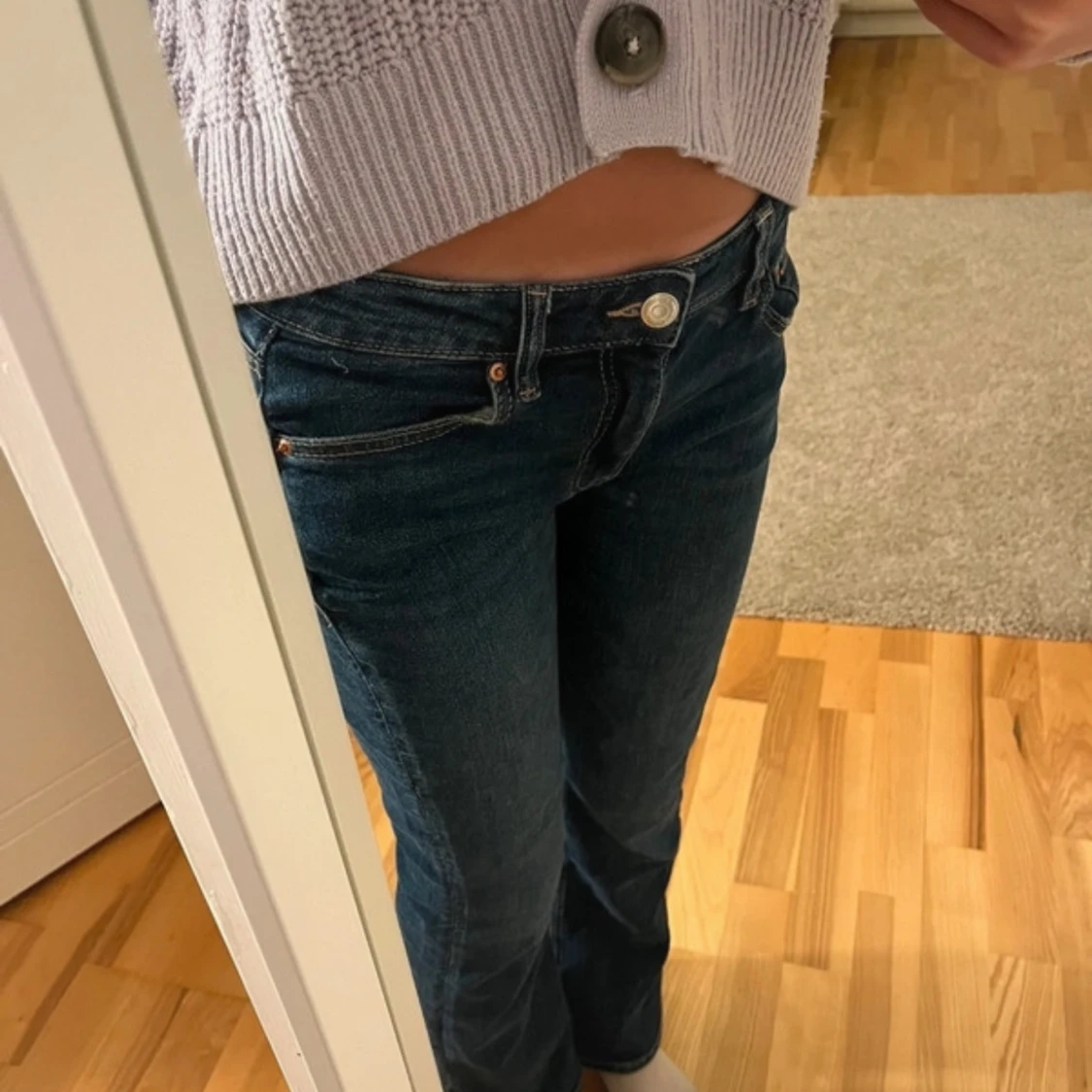 Säljer ett par snygga mörkblå jeans med låg midja. De har en klassisk femficksdesign och stängs med en knapp och dragkedja. Perfekta för vardagsbruk och kan enkelt matchas med olika toppar. Storlek 152