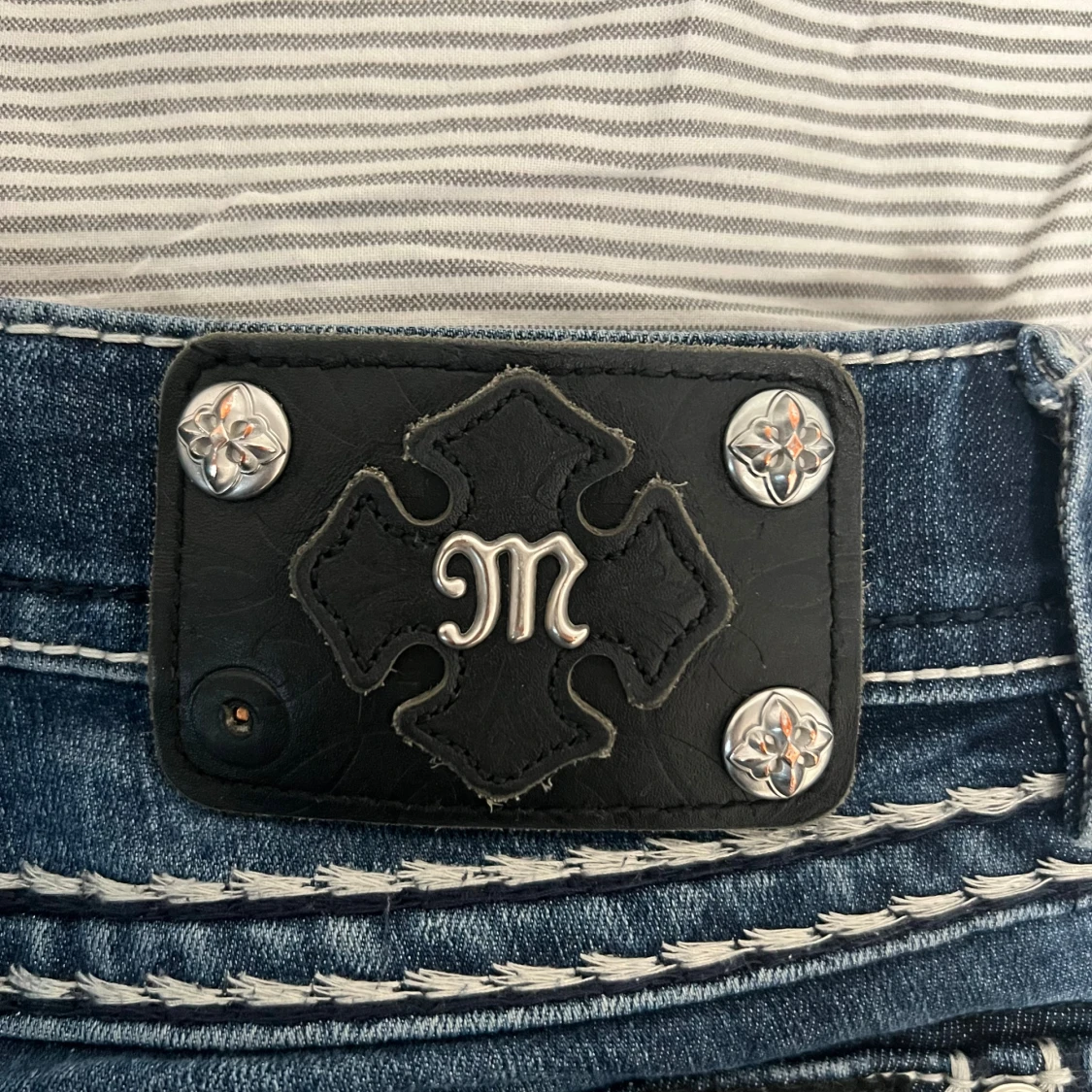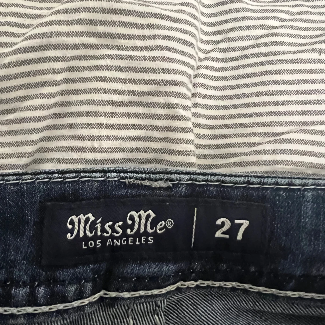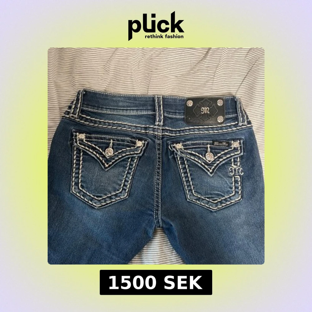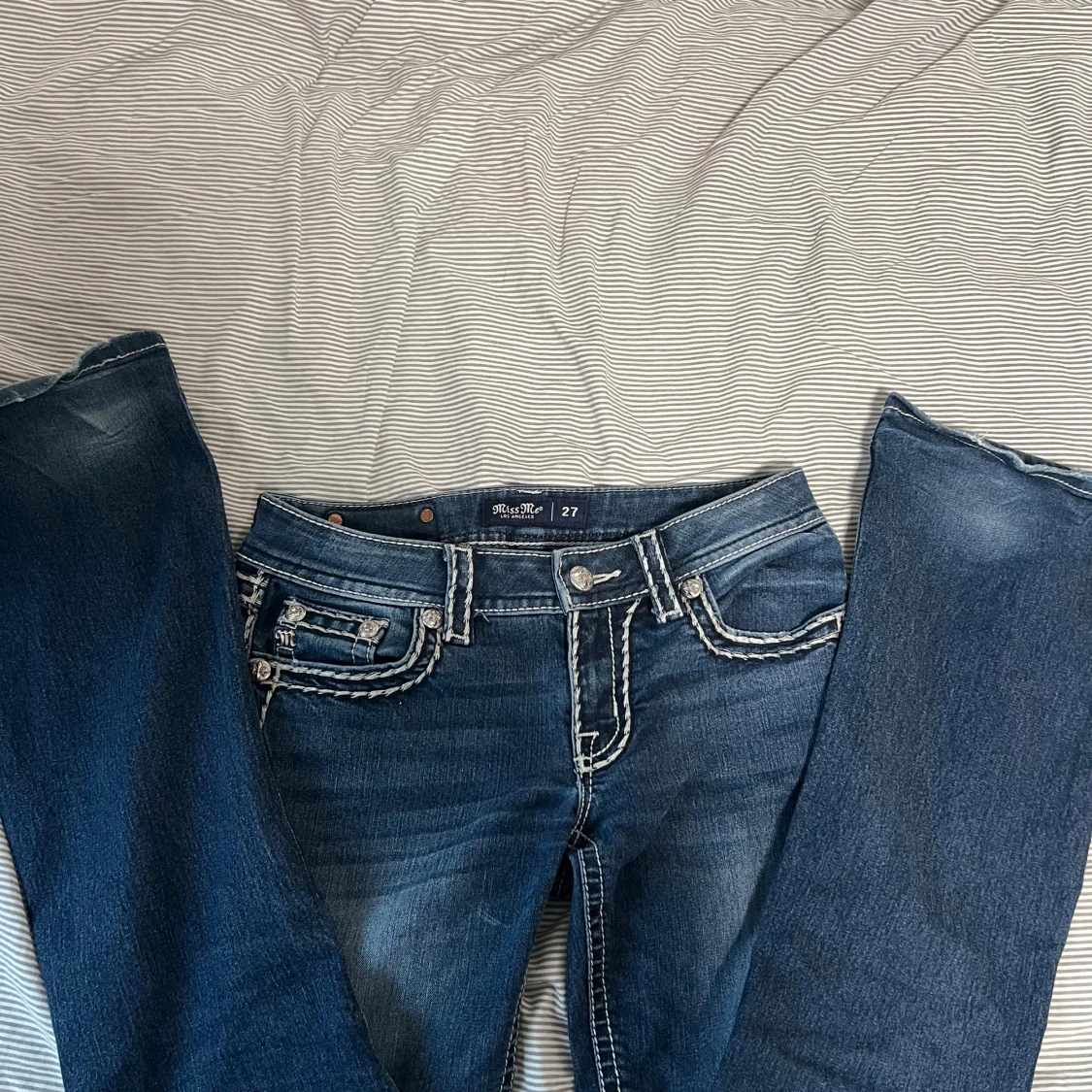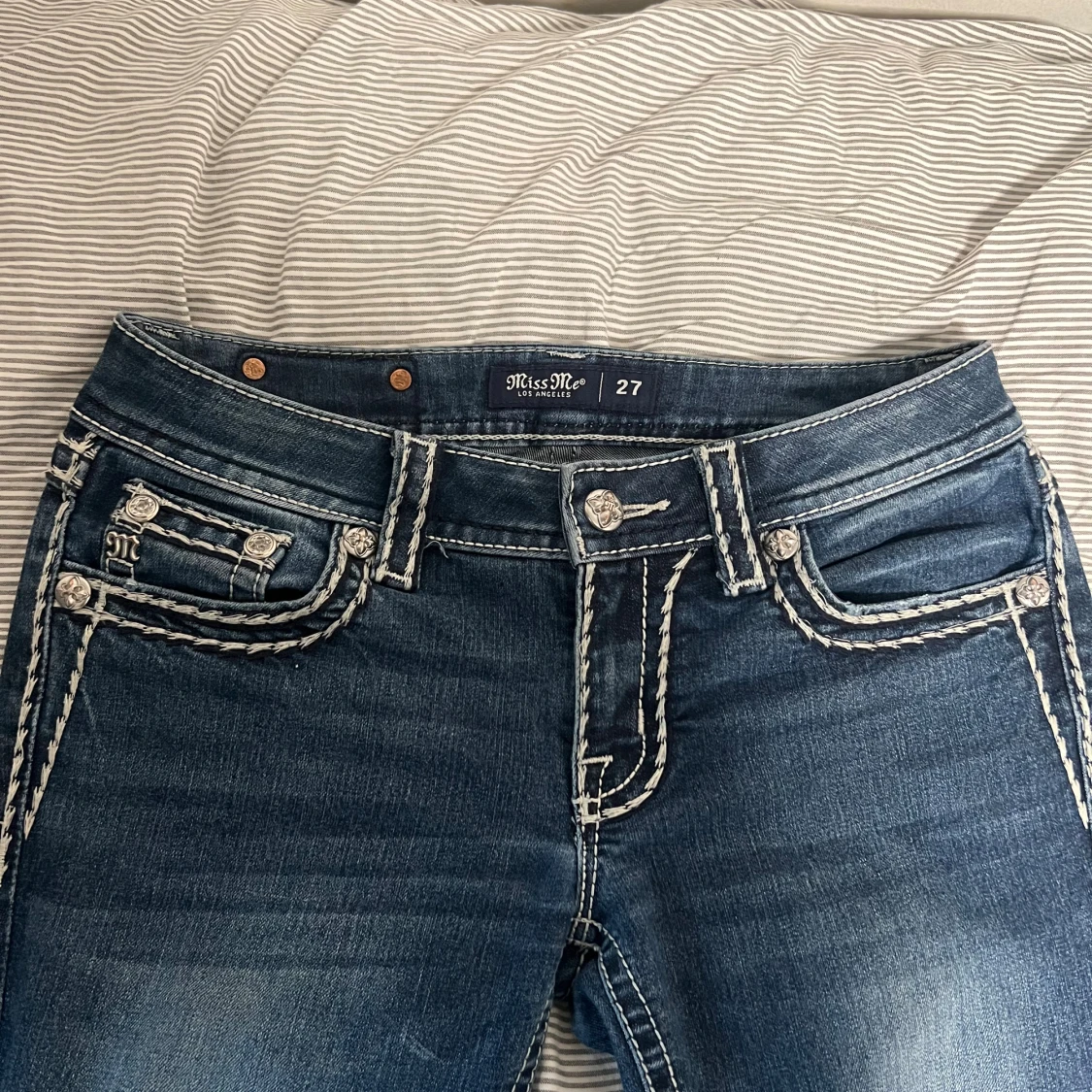 Snygga blå låg midjade jeans från Miss Me! Säljer för att de int ekonomer till andvändning tyvärr🫶🏼En detalj där bak har strilat av och samma där nere är det lite slitage men inga hål❤️ köptes för 2300kr!