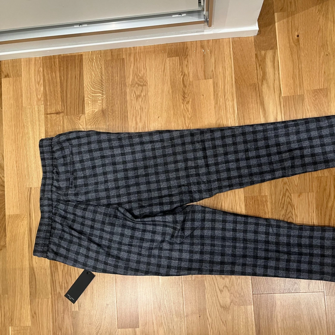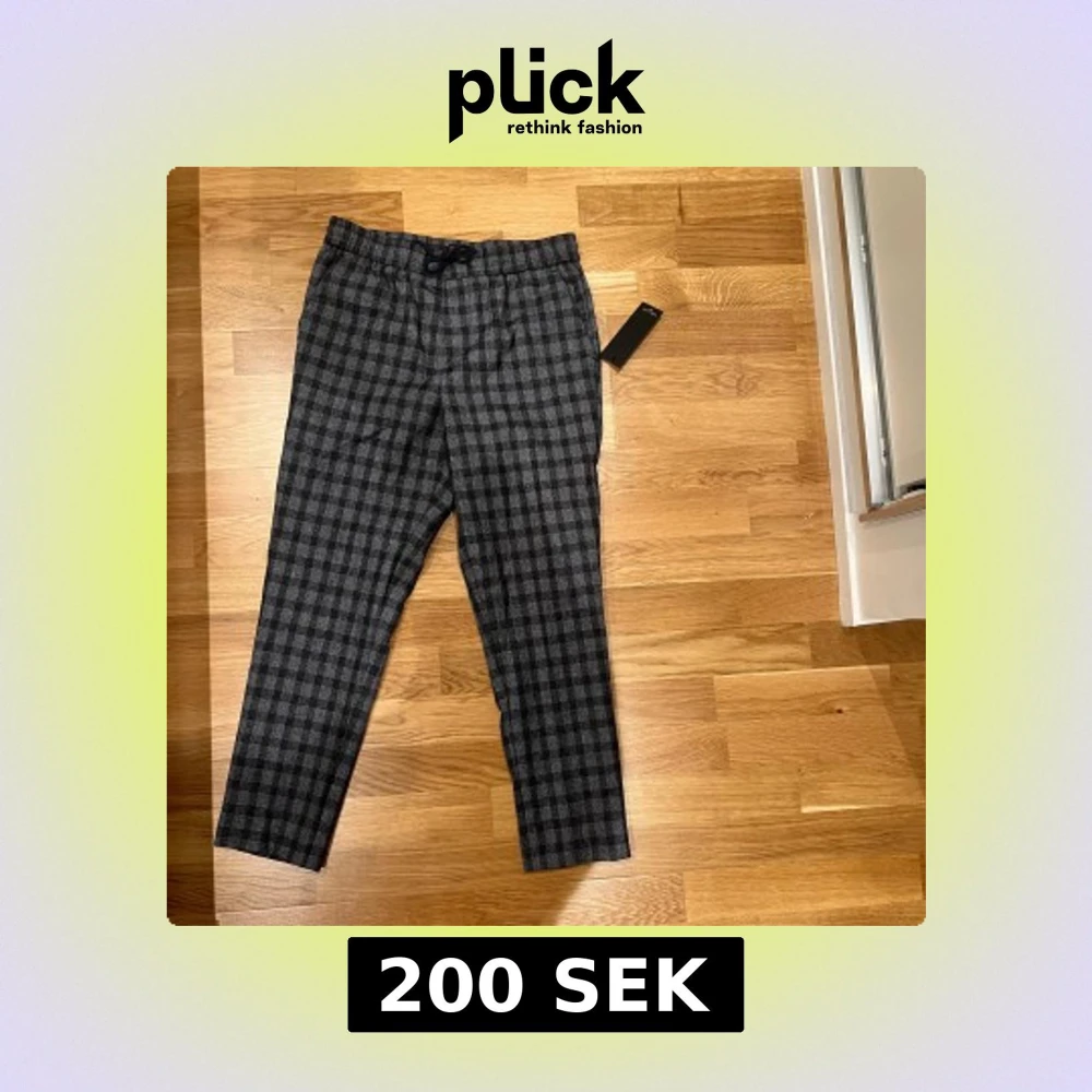 Snygga gråsvarta byxor från New Look i storlek S. Byxorna har rutigt mönster, dragsko i midjan och croppad längd. Perfekta för dig som gillar en stilren look med lite edge. Materialet känns mjukt och bekvämt, passar till många outfits.