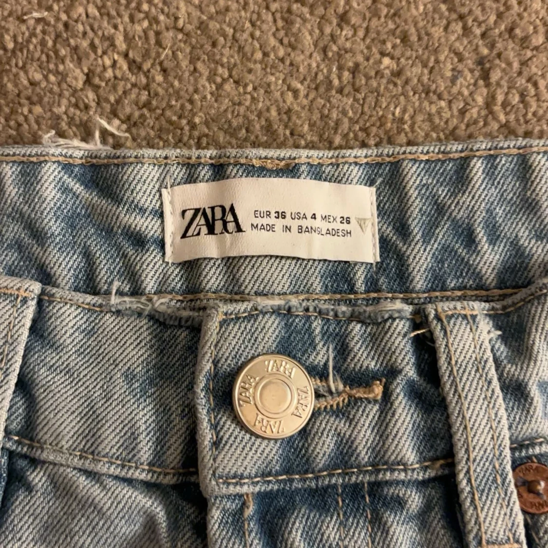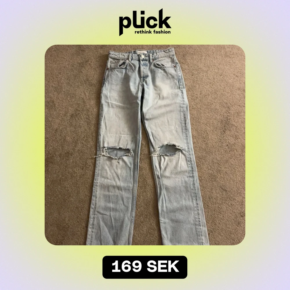 Säljer ett par ljusa jeans från Zara i storlek EUR 36. De har en avslappnad straight fit med mid waist och med slitna detaljer på knäna för en trendig look. Perfekta för vardagsbruk och kan stylas med allt från sneakers till klackar.